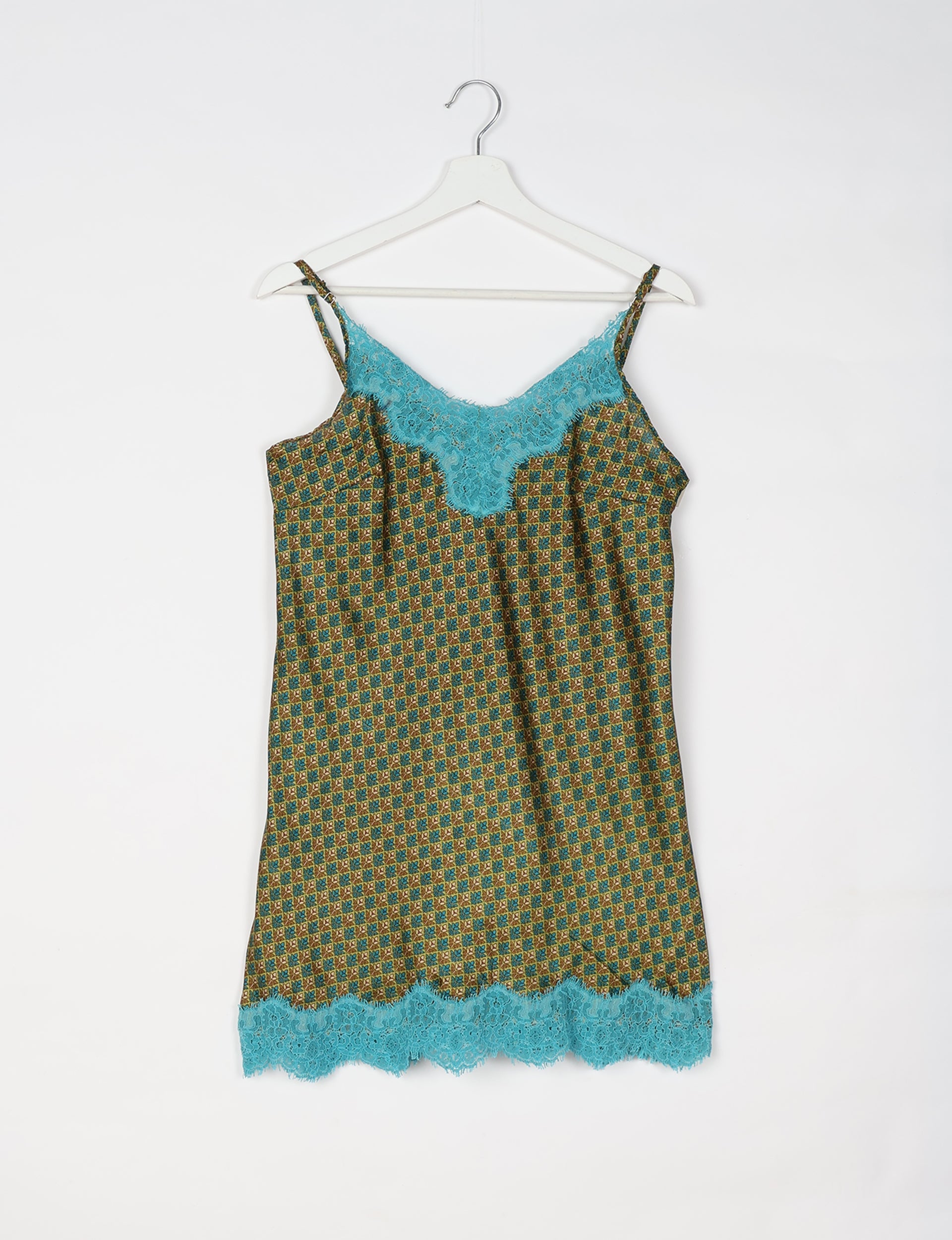 Sleeveless slip dress just falling above the knee with adjustable spaghetti straps. Features a scalloped lace insert at the neckline and a wide lace trim at the hem.