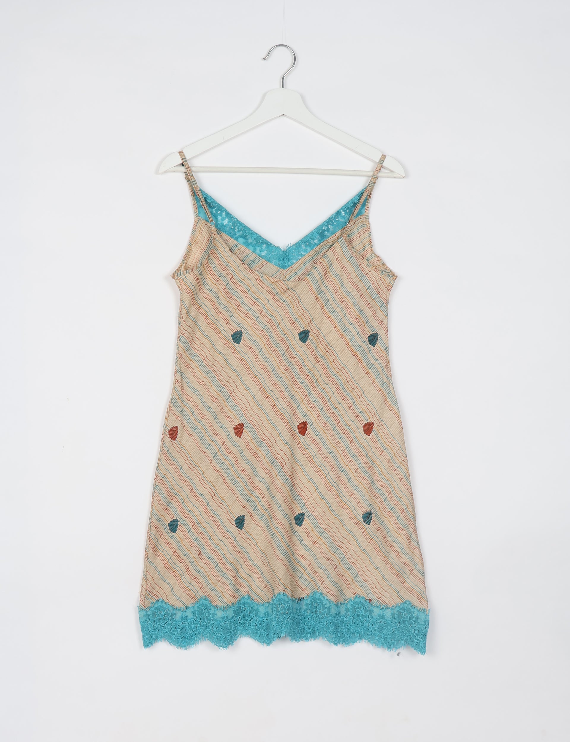 Sleeveless slip dress just falling above the knee with adjustable spaghetti straps. Features a scalloped lace insert at the neckline and a wide lace trim at the hem.
