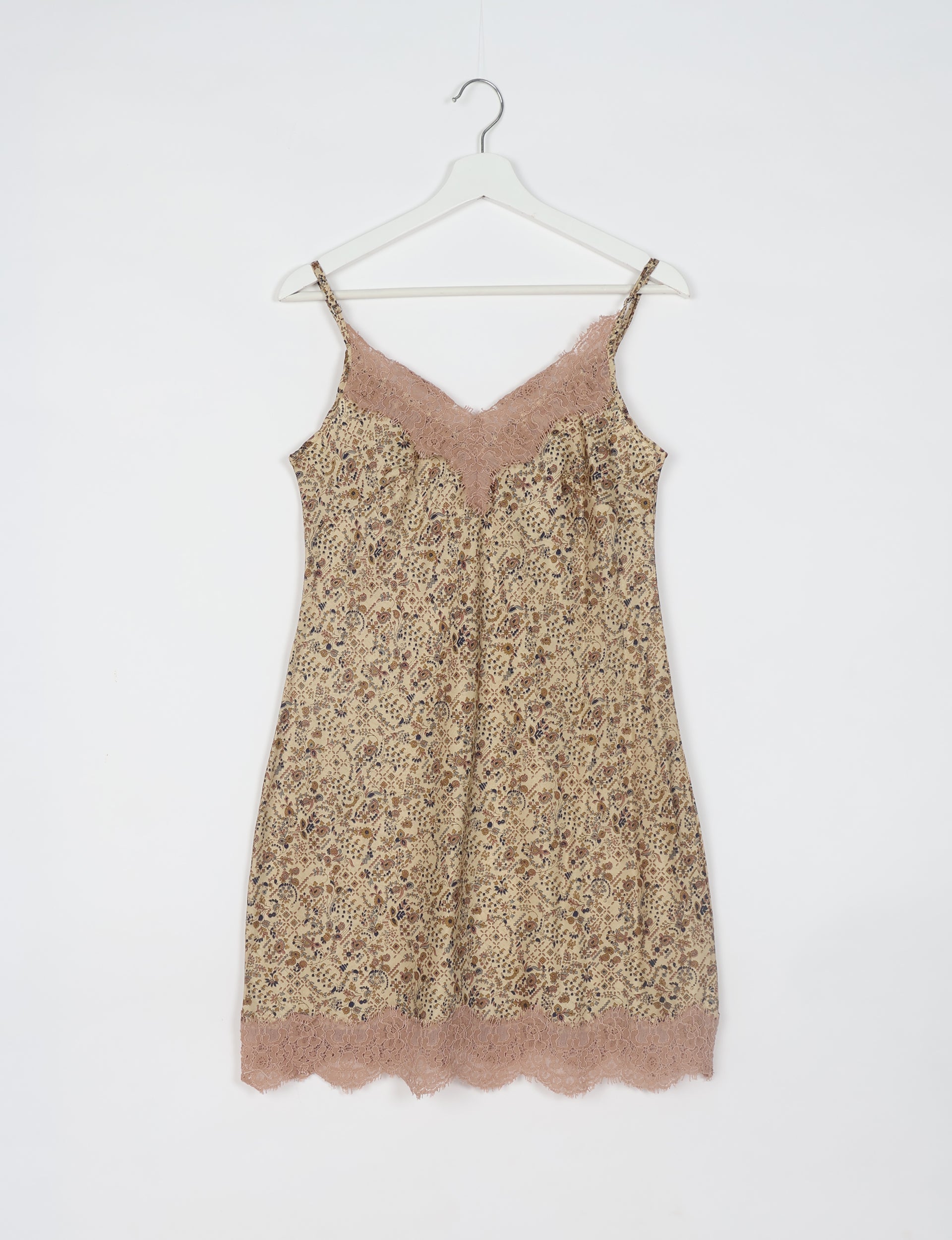 Sleeveless slip dress just falling above the knee with adjustable spaghetti straps. Features a scalloped lace insert at the neckline and a wide lace trim at the hem.
