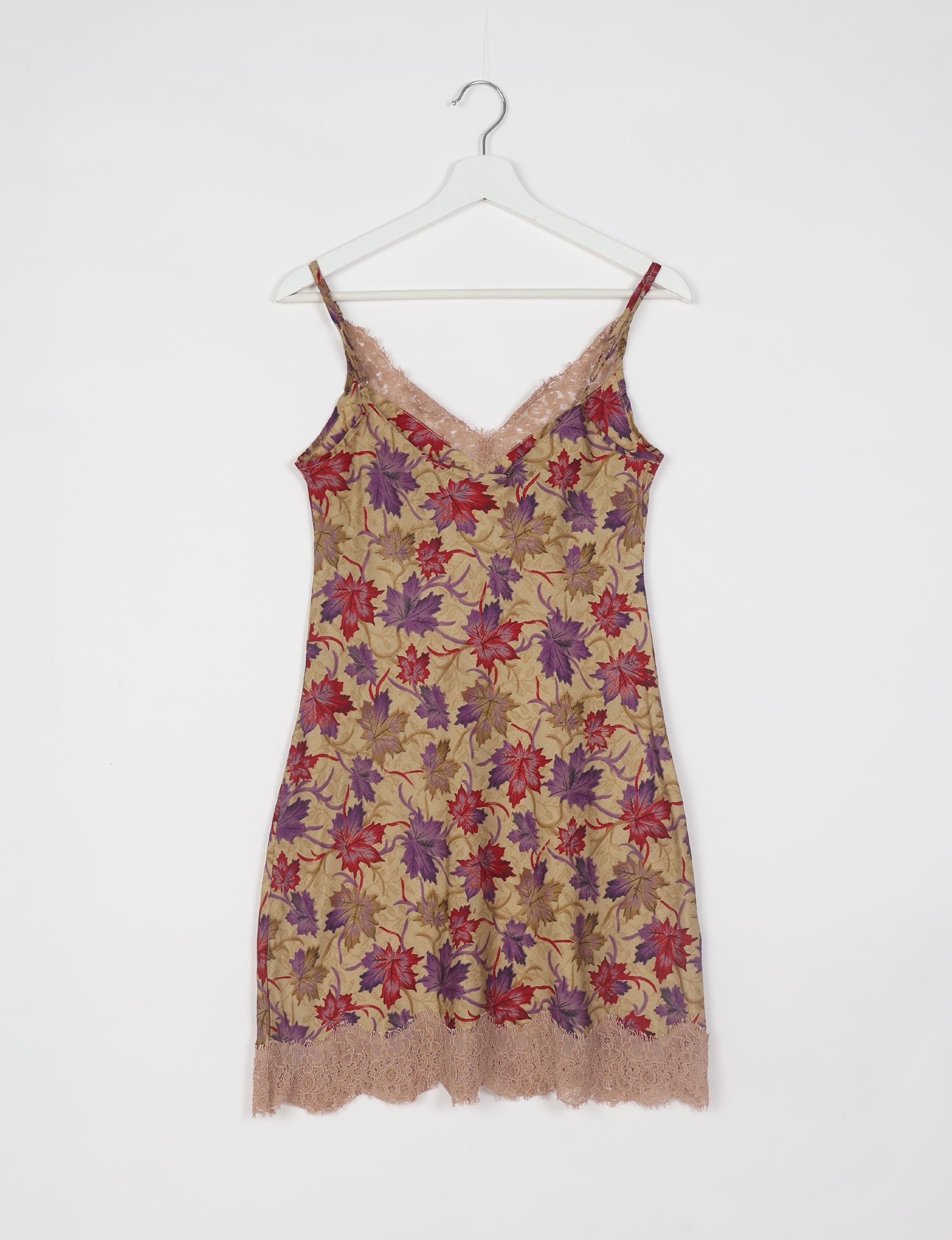 Sleeveless slip dress just falling above the knee with adjustable spaghetti straps. Features a scalloped lace insert at the neckline and a wide lace trim at the hem.