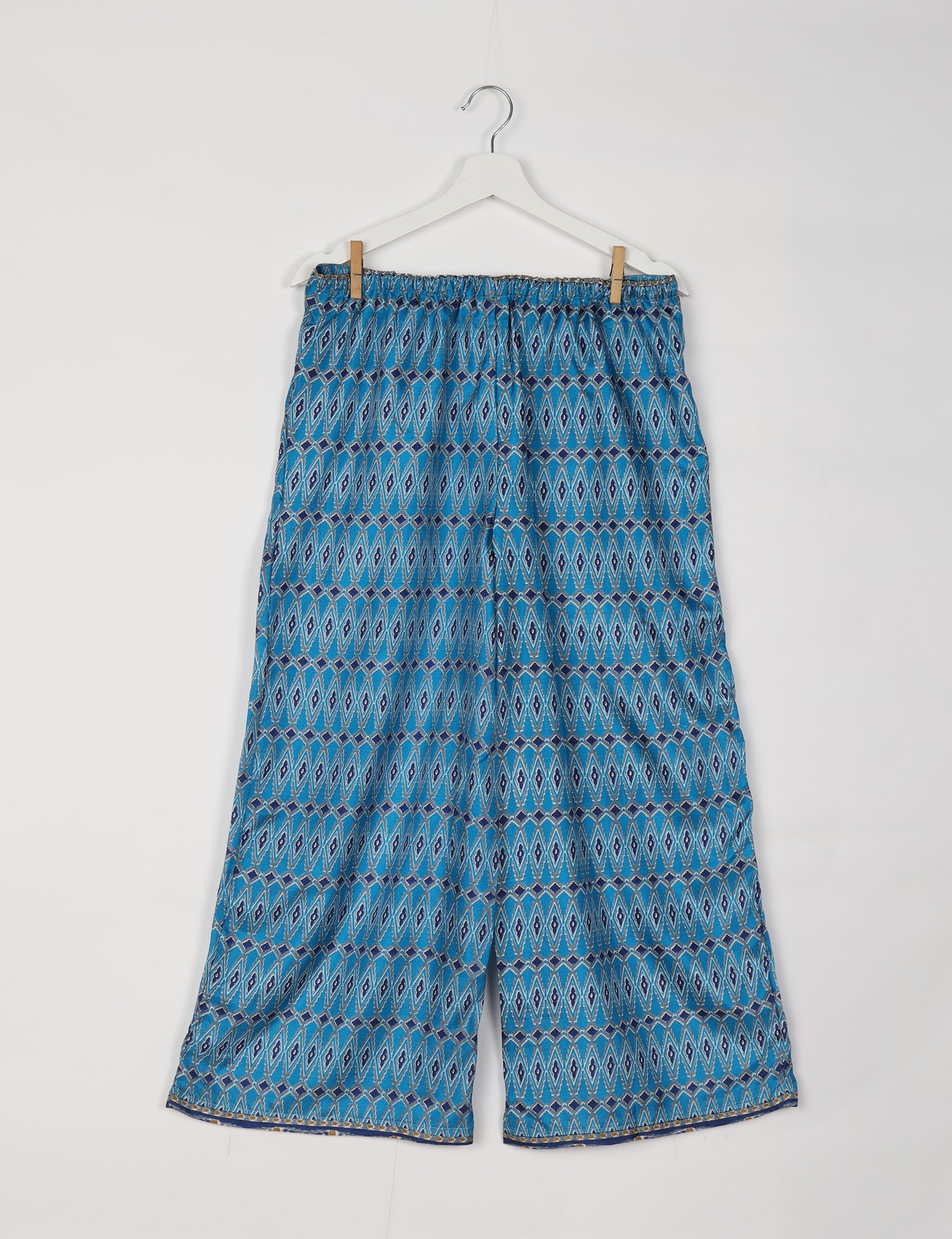 These palazzo pants feature a flat front, a fully elasticated waistband, and a wide-leg silhouette. They are ankle-length and finished with a contrast border at the hem.