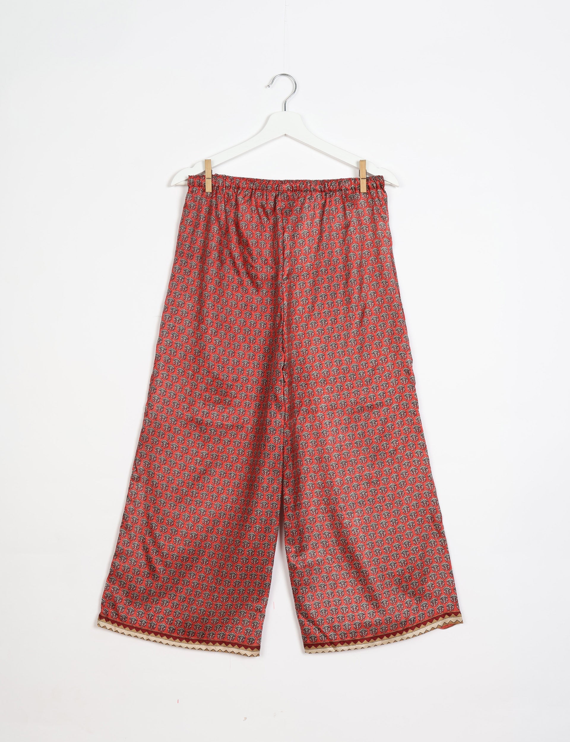 These palazzo pants feature a flat front, a fully elasticated waistband, and a wide-leg silhouette. They are ankle-length and finished with a contrast border at the hem.