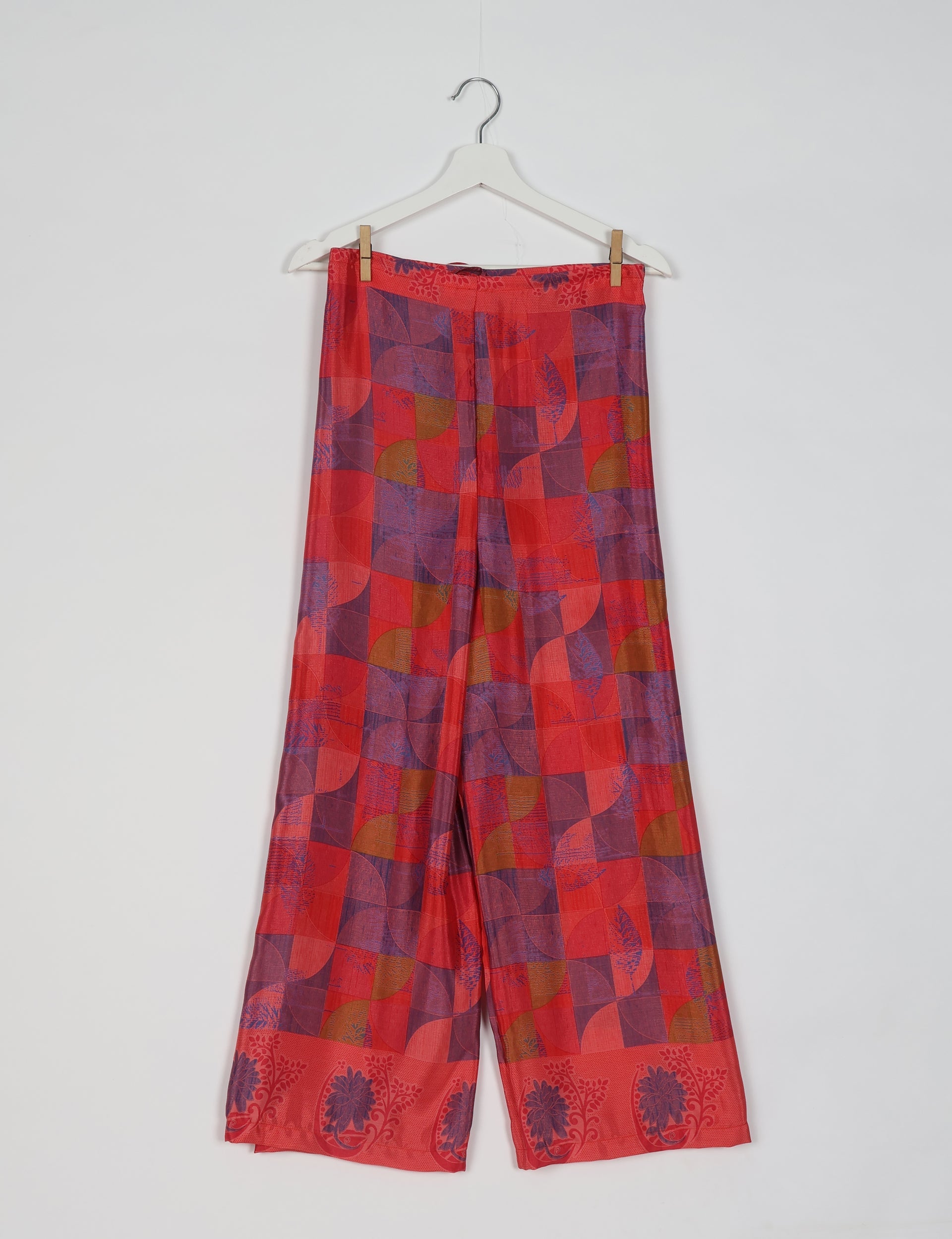 The panta pareo features a flat front and a wraparound panel that secures with extended fabric straps, allowing for an adjustable fit at the waist. The silhouette is flowy and full-length, with a generous flare from hip to hem.