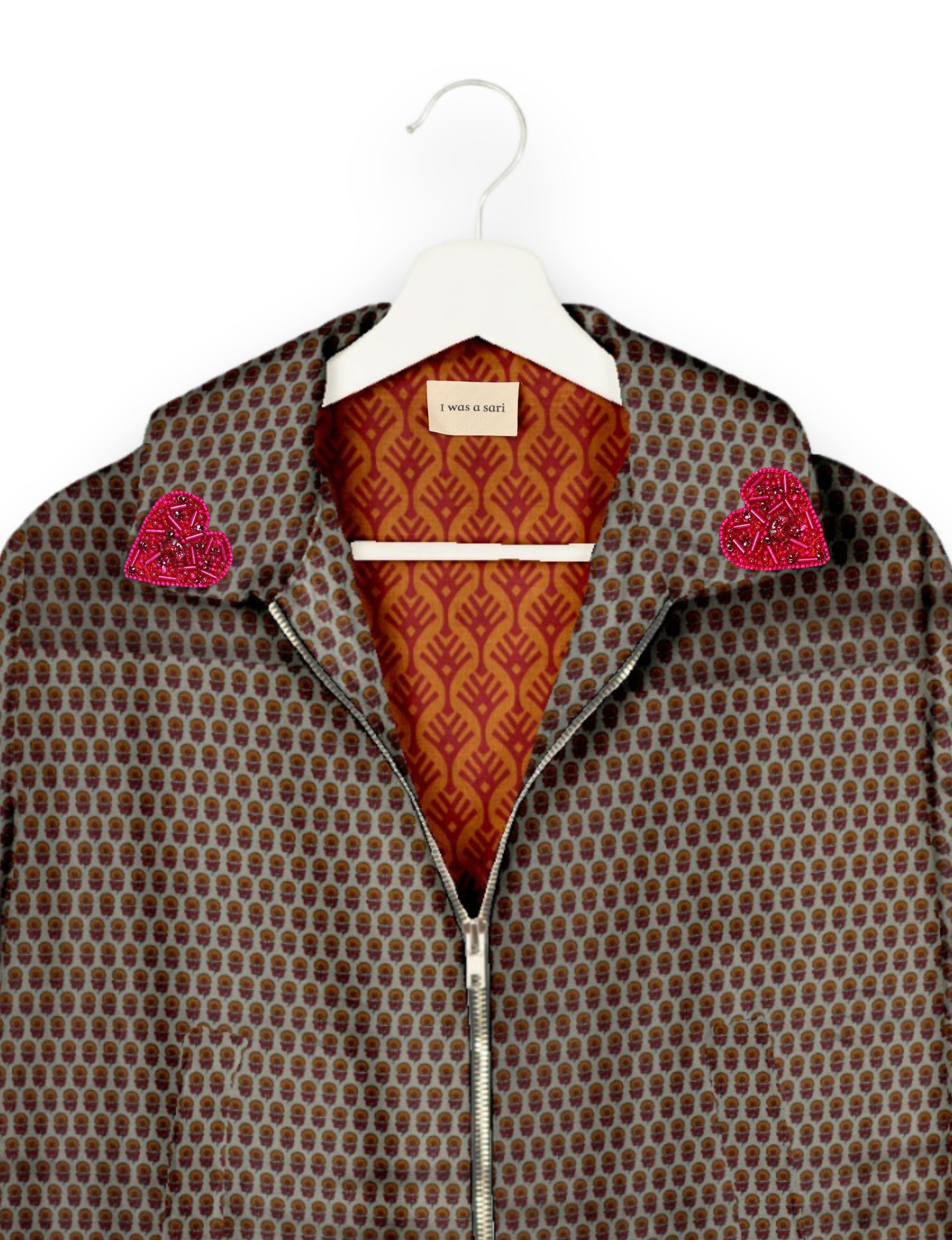 Introducing the Heart Bomber, a limited-edition sustainable fashion statement crafted from upcycled saris. Featuring intricate Aari embroidery hand-stitched by skilled female artisans, this zero waste clothing piece embodies ethical fashion and slow fashion values. Make a conscious choice with this fair trade fashion essential—eco-friendly, repurposed, and made from recycled materials. Elevate your wardrobe with carbon-neutral fashion that tells a story of artistry and sustainability. Lighting and screens may cause slight variations in color appearance.