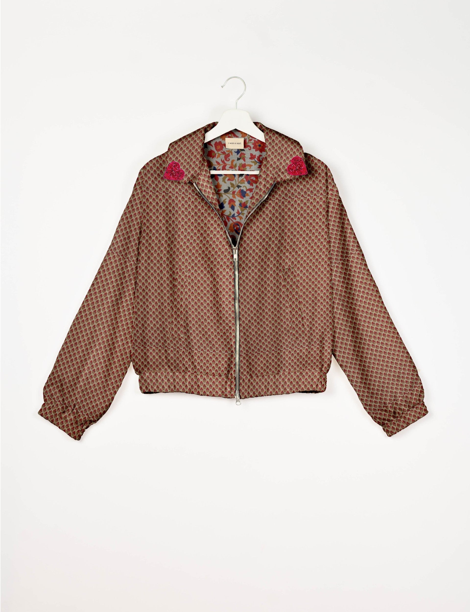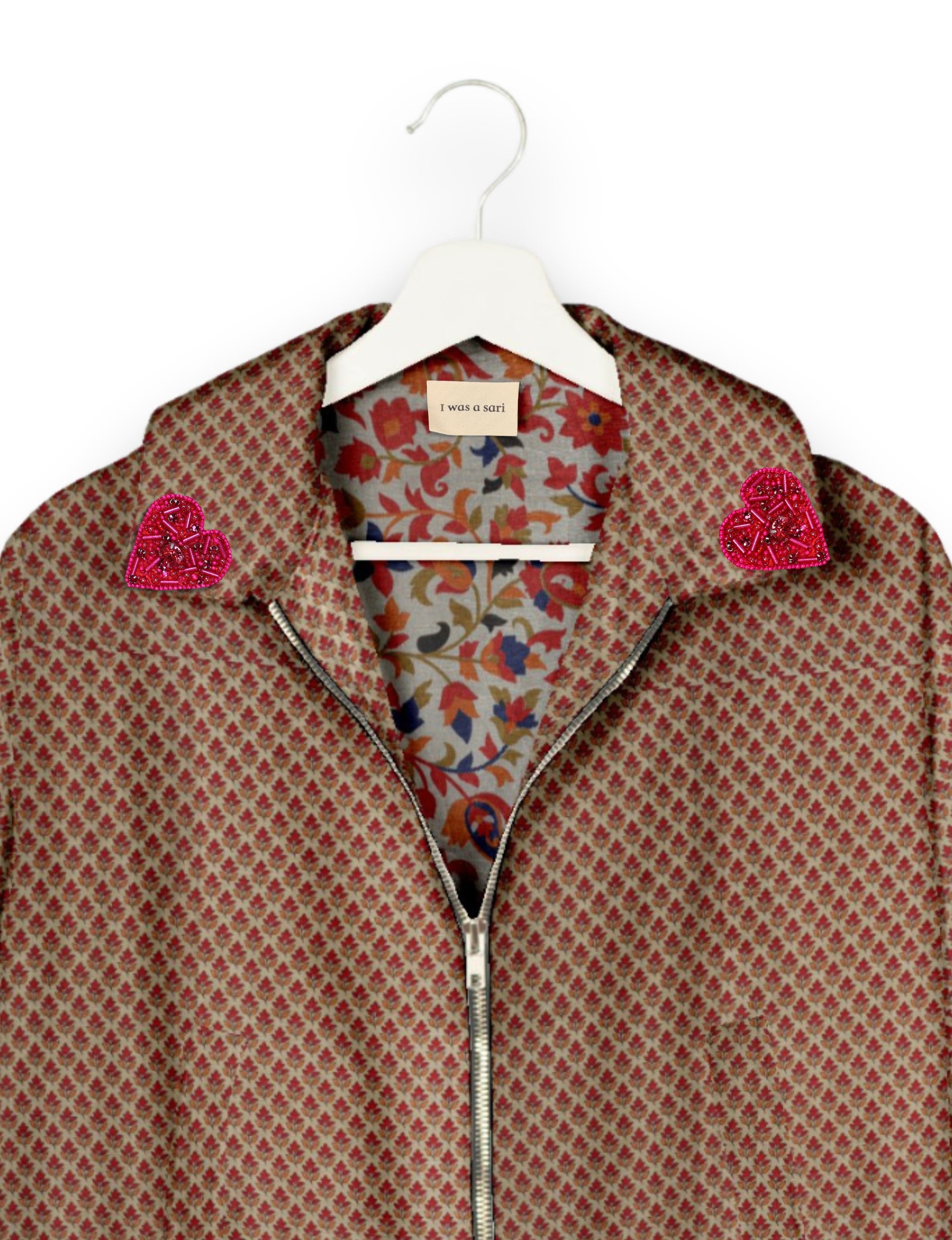 Introducing the Heart Bomber, a limited-edition sustainable fashion statement crafted from upcycled saris. Featuring intricate Aari embroidery hand-stitched by skilled female artisans, this zero waste clothing piece embodies ethical fashion and slow fashion values. Make a conscious choice with this fair trade fashion essential—eco-friendly, repurposed, and made from recycled materials. Elevate your wardrobe with carbon-neutral fashion that tells a story of artistry and sustainability. Lighting and screens may cause slight variations in color appearance.