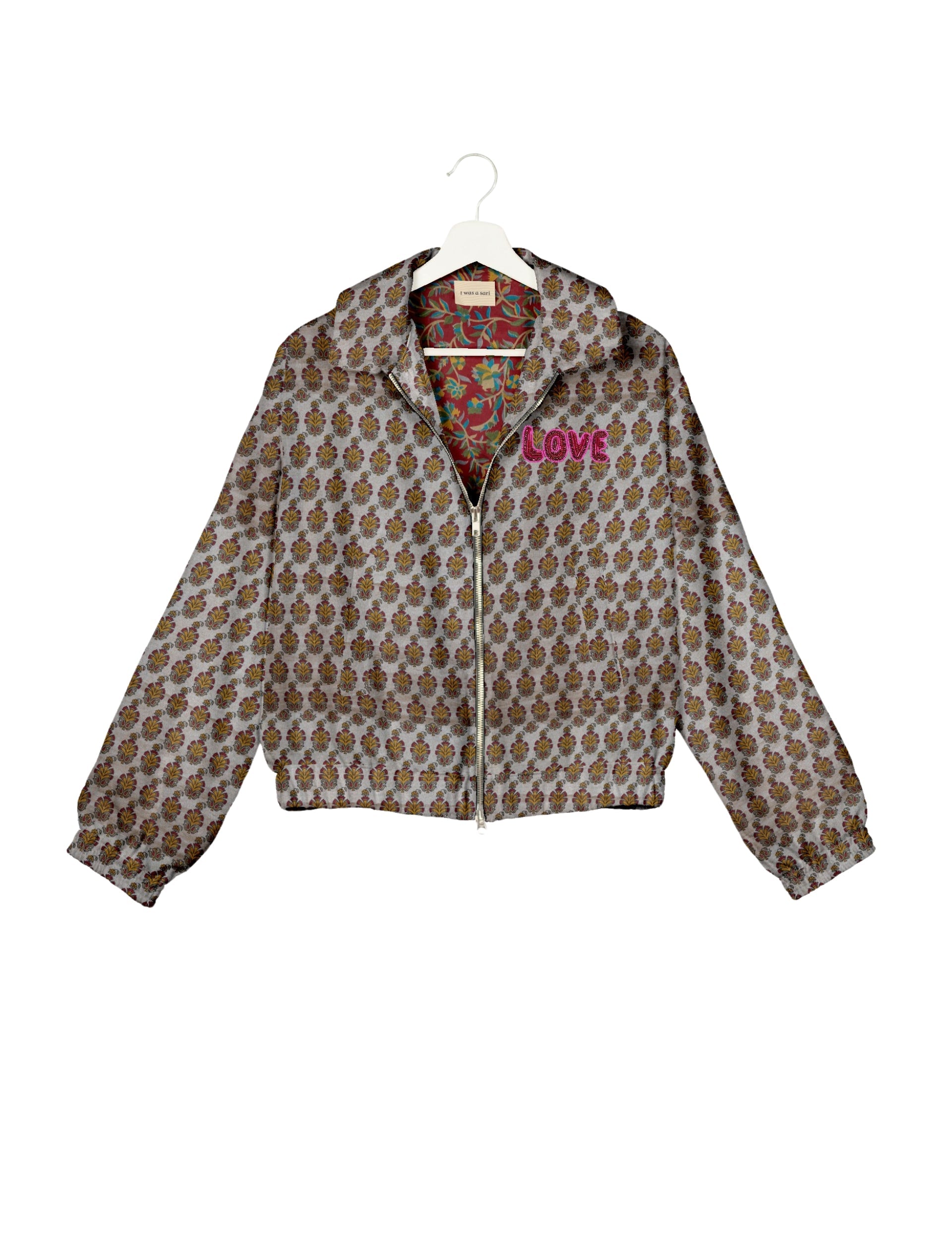 A special edition of the Classic Bomber , elevated with intricate handcrafted Aari embroidery that spells out "Love". And by our female artisans no less. Crafted from upcycled saris, this jacket is more than just a statement piece—it's a wearable story of artistry, tradition, and conscious living.