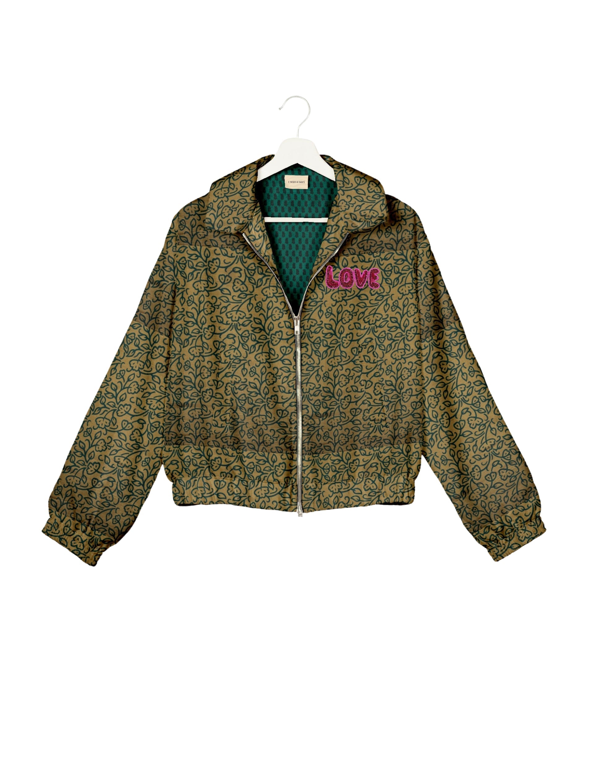 A special edition of the Classic Bomber , elevated with intricate handcrafted Aari embroidery that spells out "Love". And by our female artisans no less. Crafted from upcycled saris, this jacket is more than just a statement piece—it's a wearable story of artistry, tradition, and conscious living.