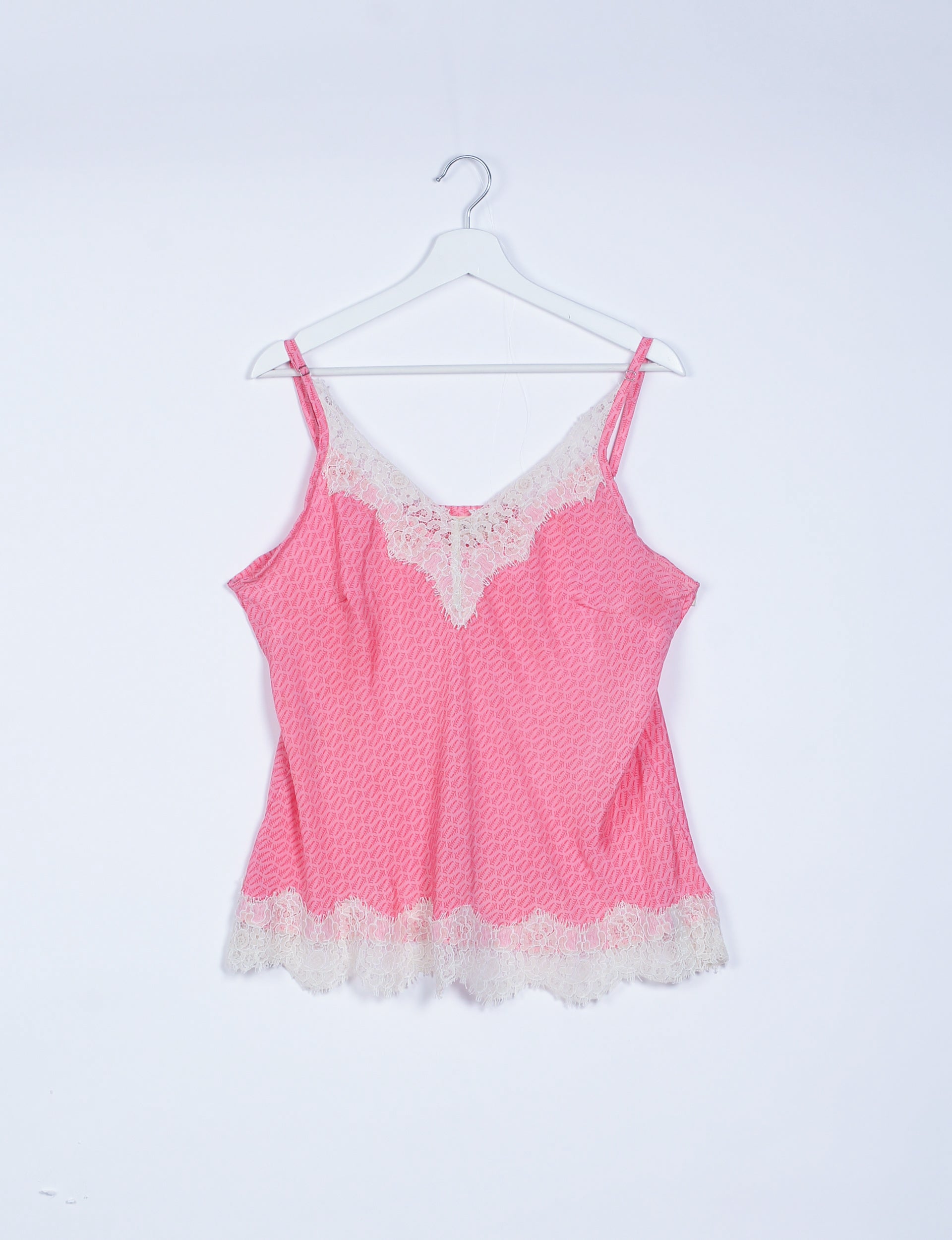Two-piece sleepwear set consisting of a camisole top and straight-fit pants. The camisole features adjustable spaghetti straps and is finished with lace trim along the neckline and hem. The pants have a relaxed fit with an elasticated waist.