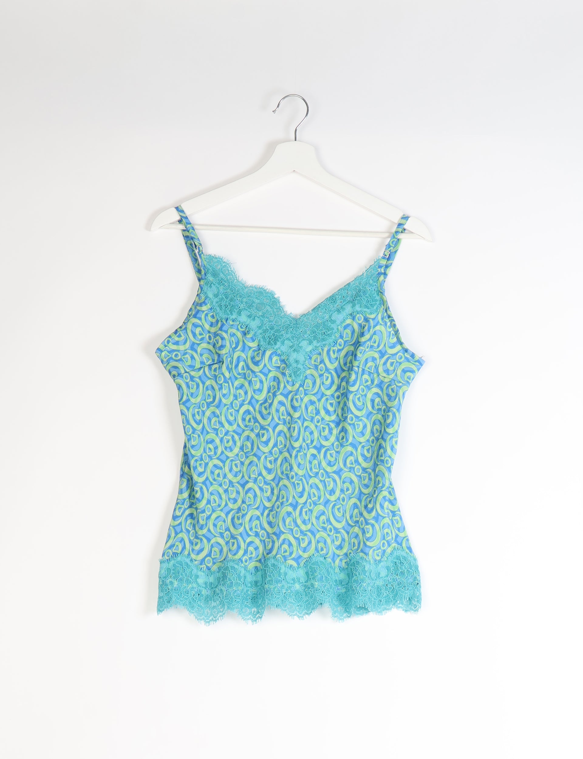 Two-piece sleepwear set consisting of a camisole top and straight-fit pants. The camisole features adjustable spaghetti straps and is finished with lace trim along the neckline and hem. The pants have a relaxed fit with an elasticated waist.