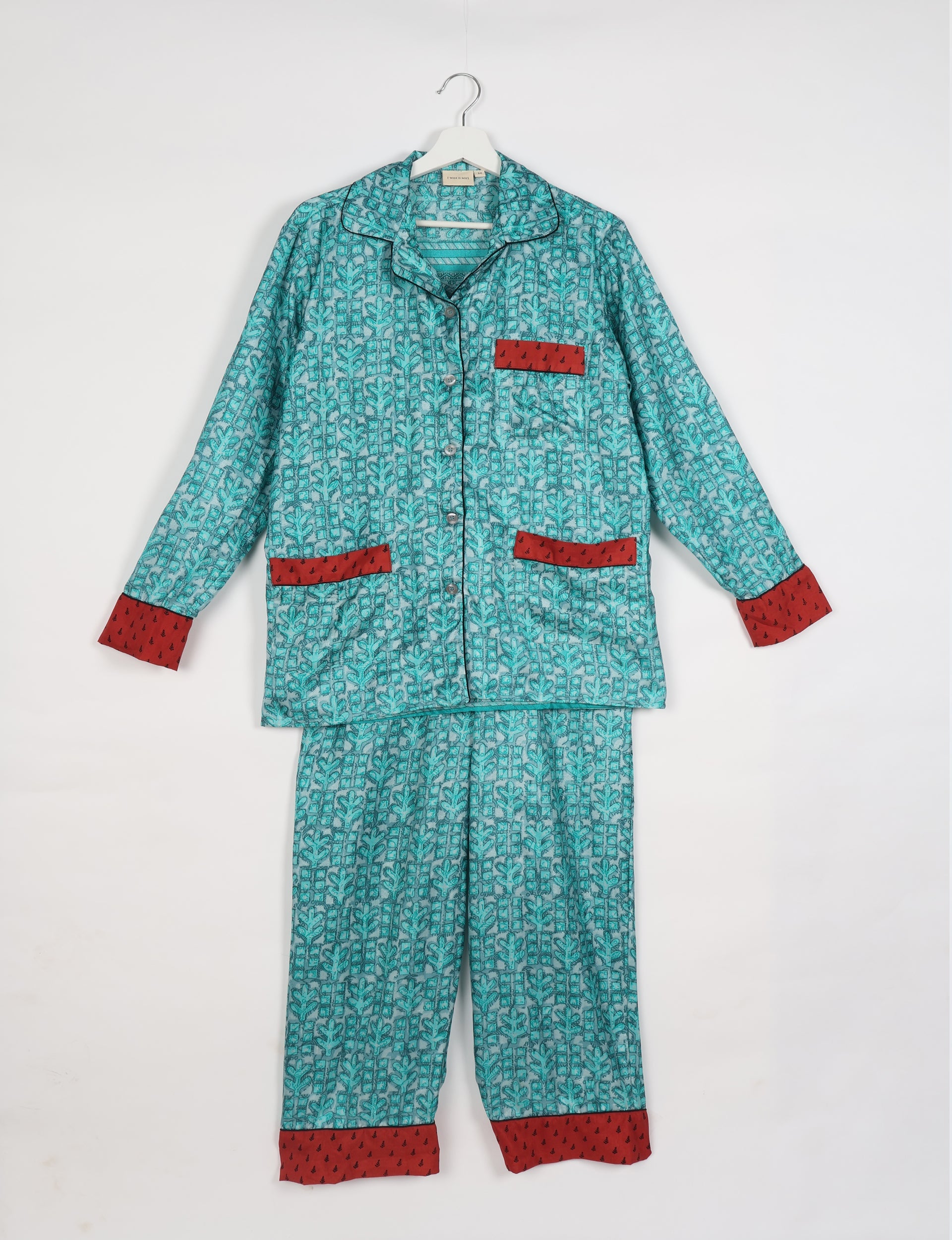 Two-piece coordinated pyjama set consisting of a full-sleeve button-down shirt and relaxed straight-leg pants. The shirt features notch lapels, contrast piping, front patch pockets, and a button down placket. The pants have an elasticated waistband with button closure. Both top and bottom are finished with printed contrast hems.