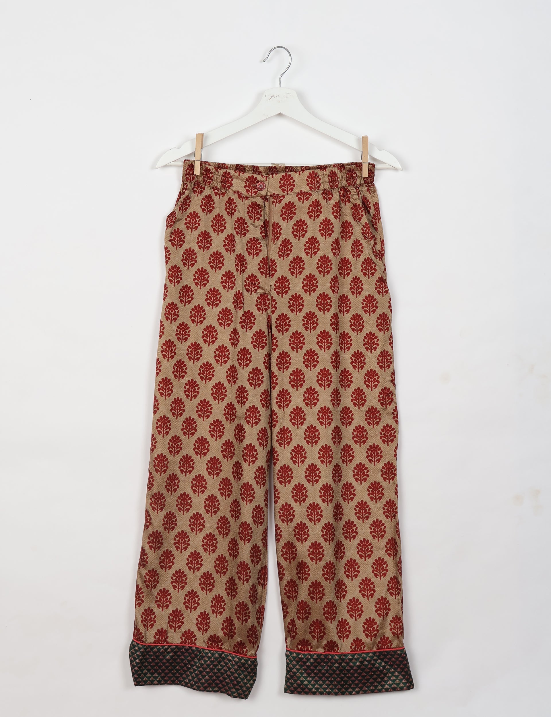 Two-piece coordinated pyjama set consisting of a full-sleeve button-down shirt and relaxed straight-leg pants. The shirt features notch lapels, contrast piping, front patch pockets, and a button down placket. The pants have an elasticated waistband with button closure. Both top and bottom are finished with printed contrast hems.