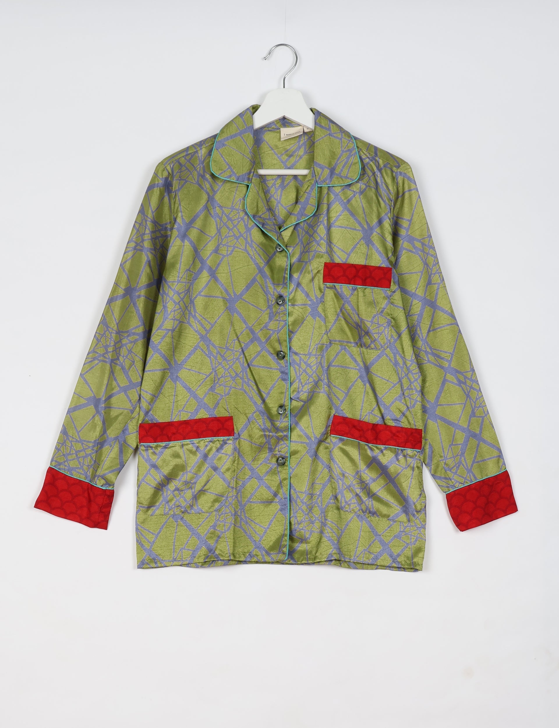 Two-piece coordinated pyjama set consisting of a full-sleeve button-down shirt and relaxed straight-leg pants. The shirt features notch lapels, contrast piping, front patch pockets, and a button down placket. The pants have an elasticated waistband with button closure. Both top and bottom are finished with printed contrast hems.
