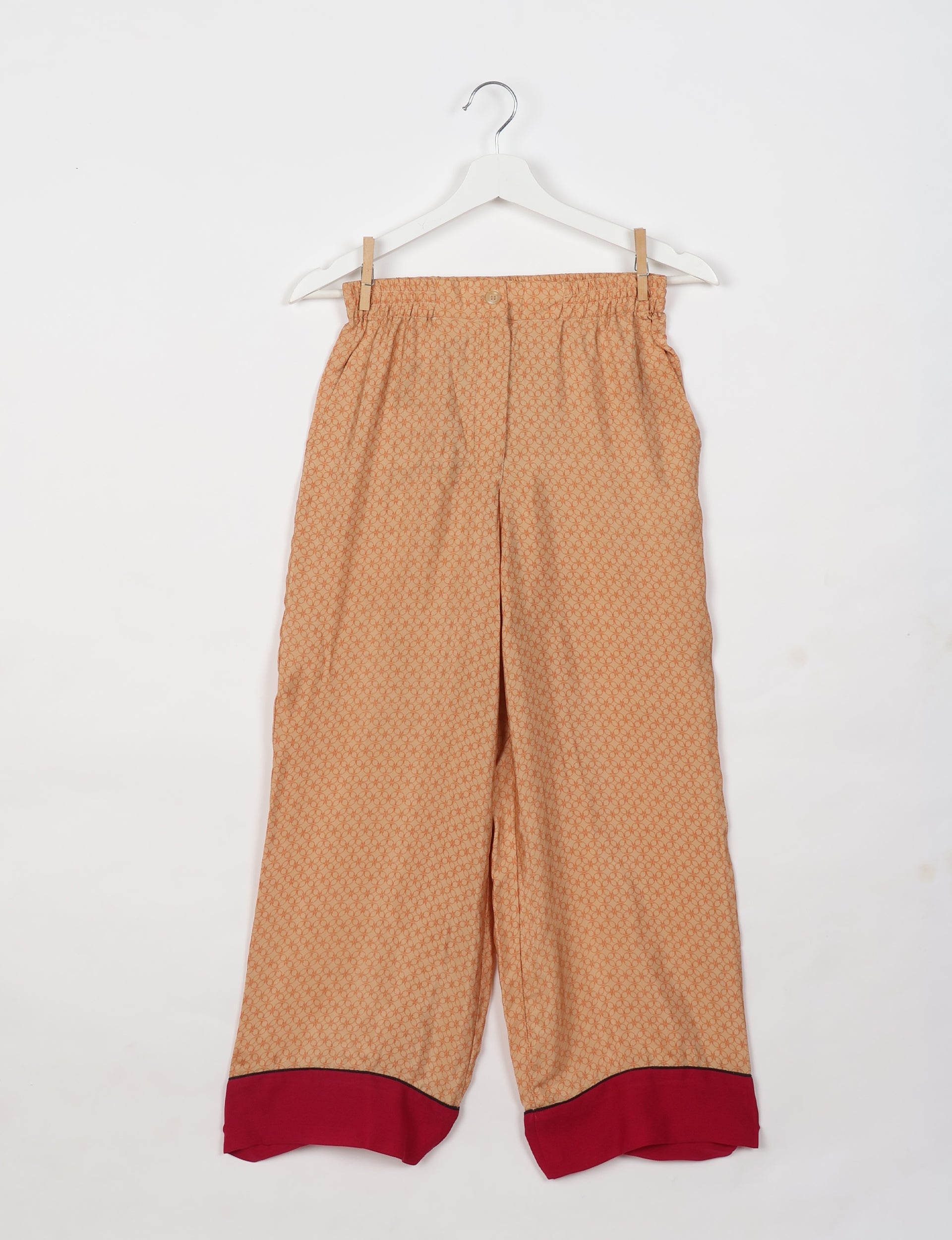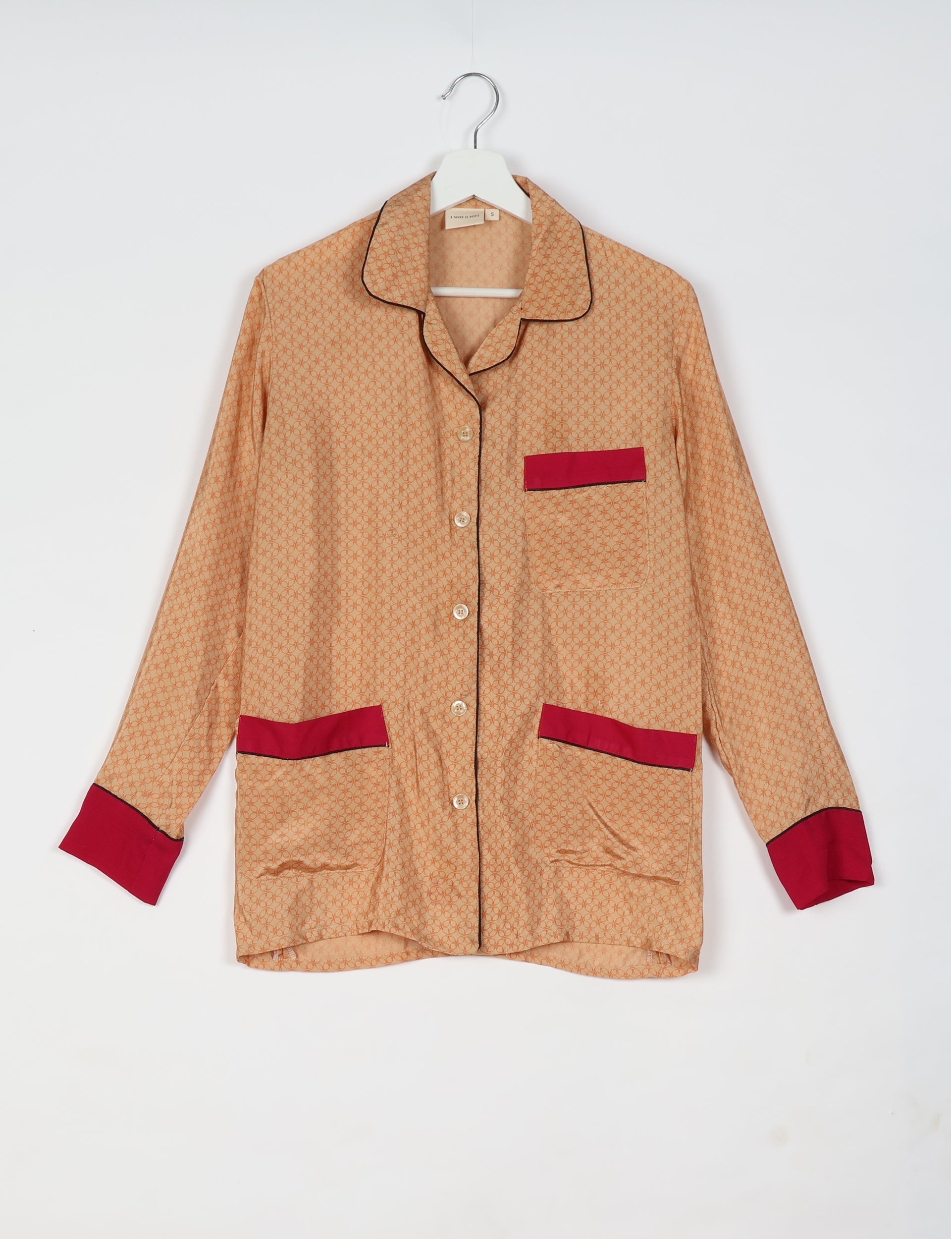 Two-piece coordinated pyjama set consisting of a full-sleeve button-down shirt and relaxed straight-leg pants. The shirt features notch lapels, contrast piping, front patch pockets, and a button down placket. The pants have an elasticated waistband with button closure. Both top and bottom are finished with printed contrast hems.