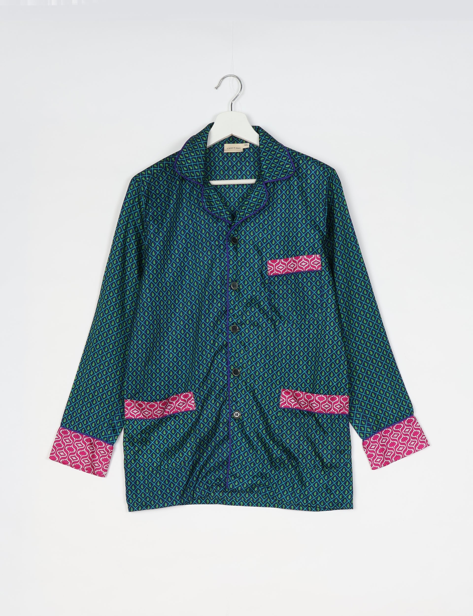 Two-piece coordinated pyjama set consisting of a full-sleeve button-down shirt and relaxed straight-leg pants. The shirt features notch lapels, contrast piping, front patch pockets, and a button down placket. The pants have an elasticated waistband with button closure. Both top and bottom are finished with printed contrast hems.