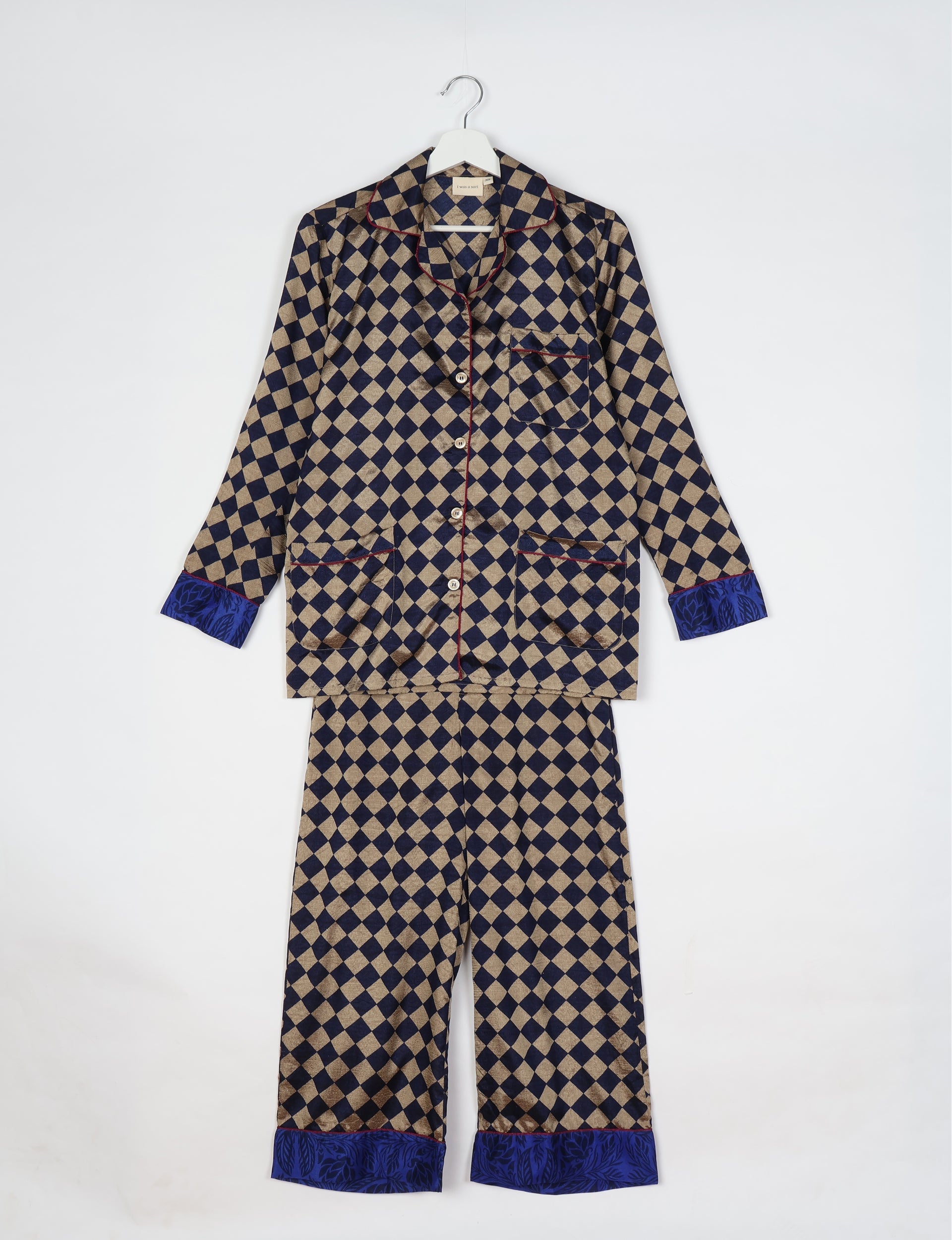 Two-piece coordinated pyjama set consisting of a full-sleeve button-down shirt and relaxed straight-leg pants. The shirt features notch lapels, contrast piping, front patch pockets, and a button down placket. The pants have an elasticated waistband with button closure. Both top and bottom are finished with printed contrast hems.