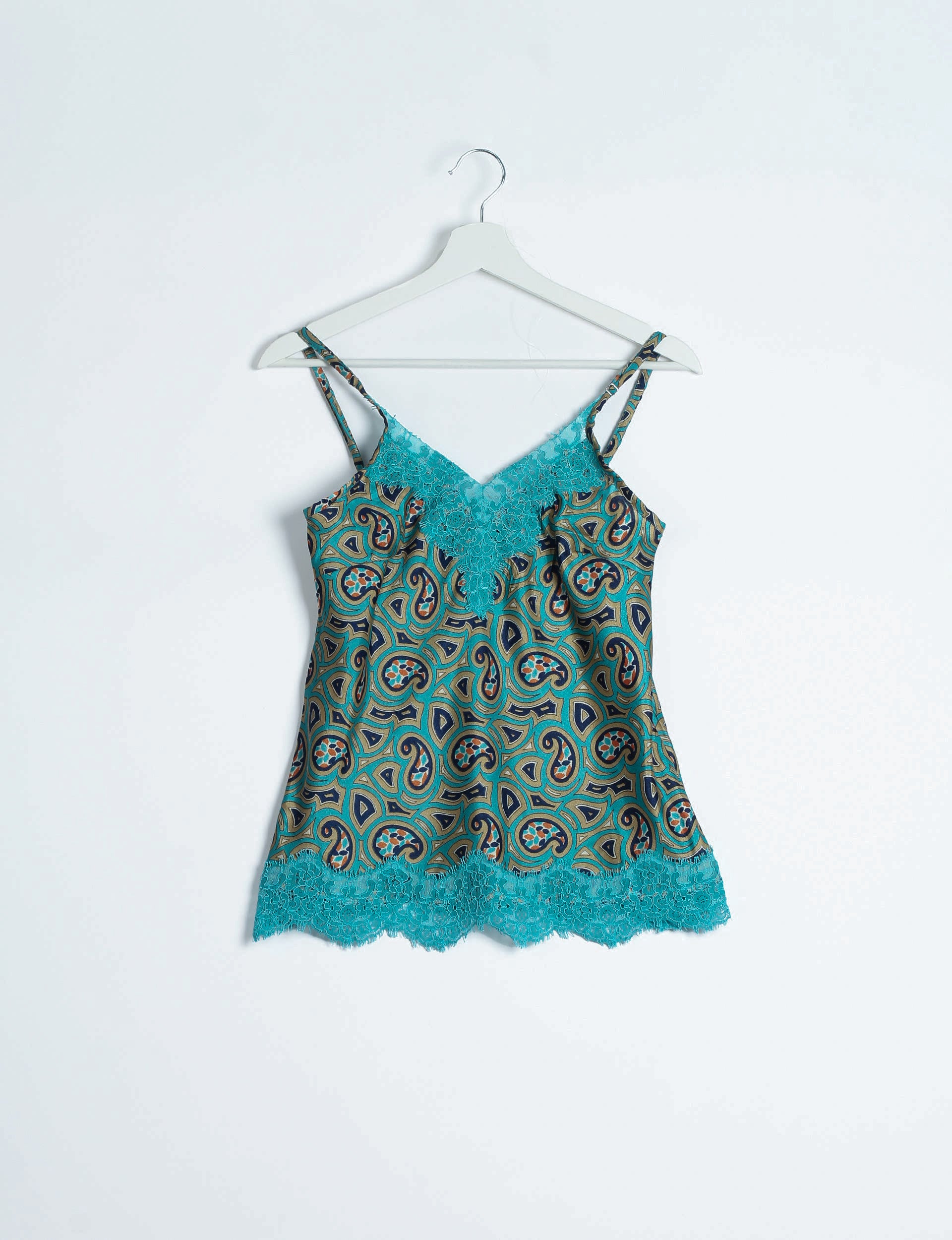 Two-piece sleepwear set consisting of a camisole top and straight-fit pants. The camisole features adjustable spaghetti straps and is finished with lace trim along the neckline and hem. The pants have a relaxed fit with an elasticated waist.