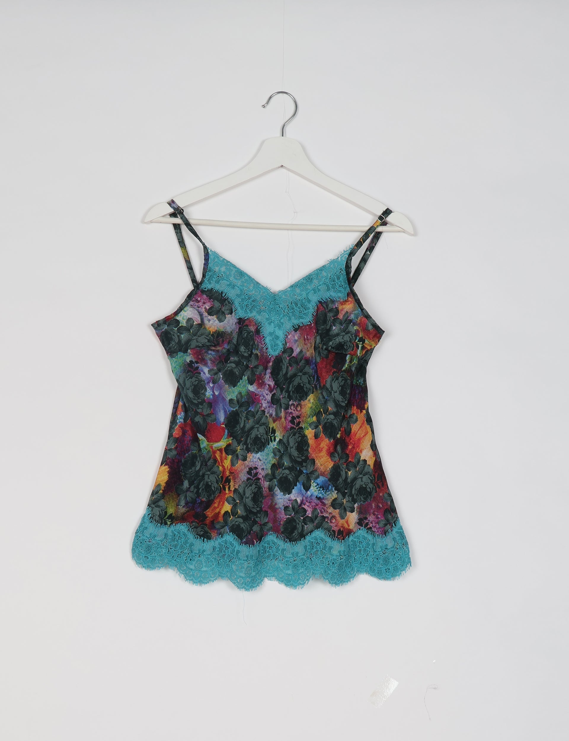 Two-piece sleepwear set consisting of a camisole top and straight-fit pants. The camisole features adjustable spaghetti straps and is finished with lace trim along the neckline and hem. The pants have a relaxed fit with an elasticated waist.