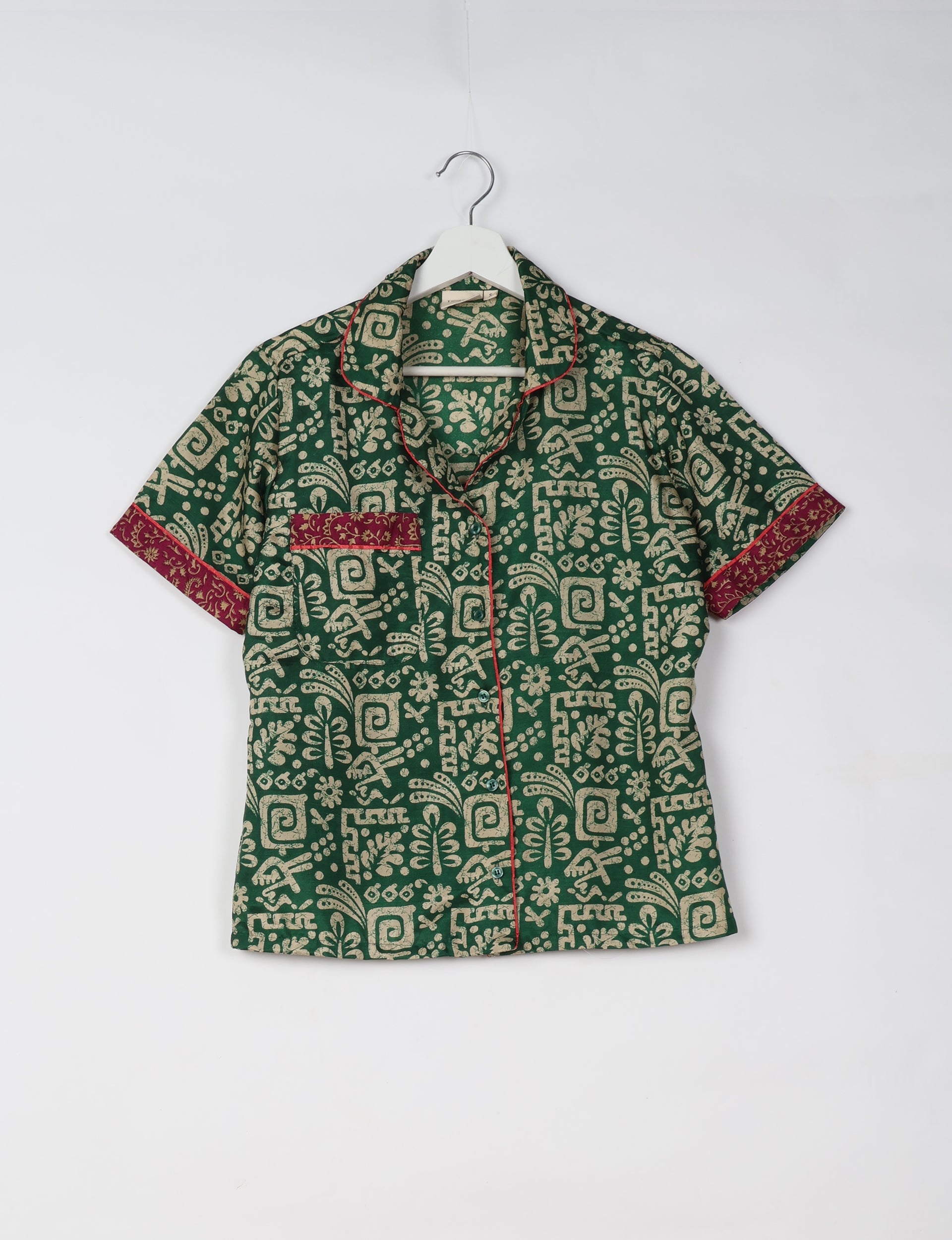 Two-piece nightwear set including a short-sleeved shirt and elasticated shorts. The shirt features a notched collar, front button closure with buttons, and a single chest pocket with contrast trim detail. The shorts have an elasticated waistband and contrast hem cuffs. Lighting and screens may cause slight variations in color appearance.