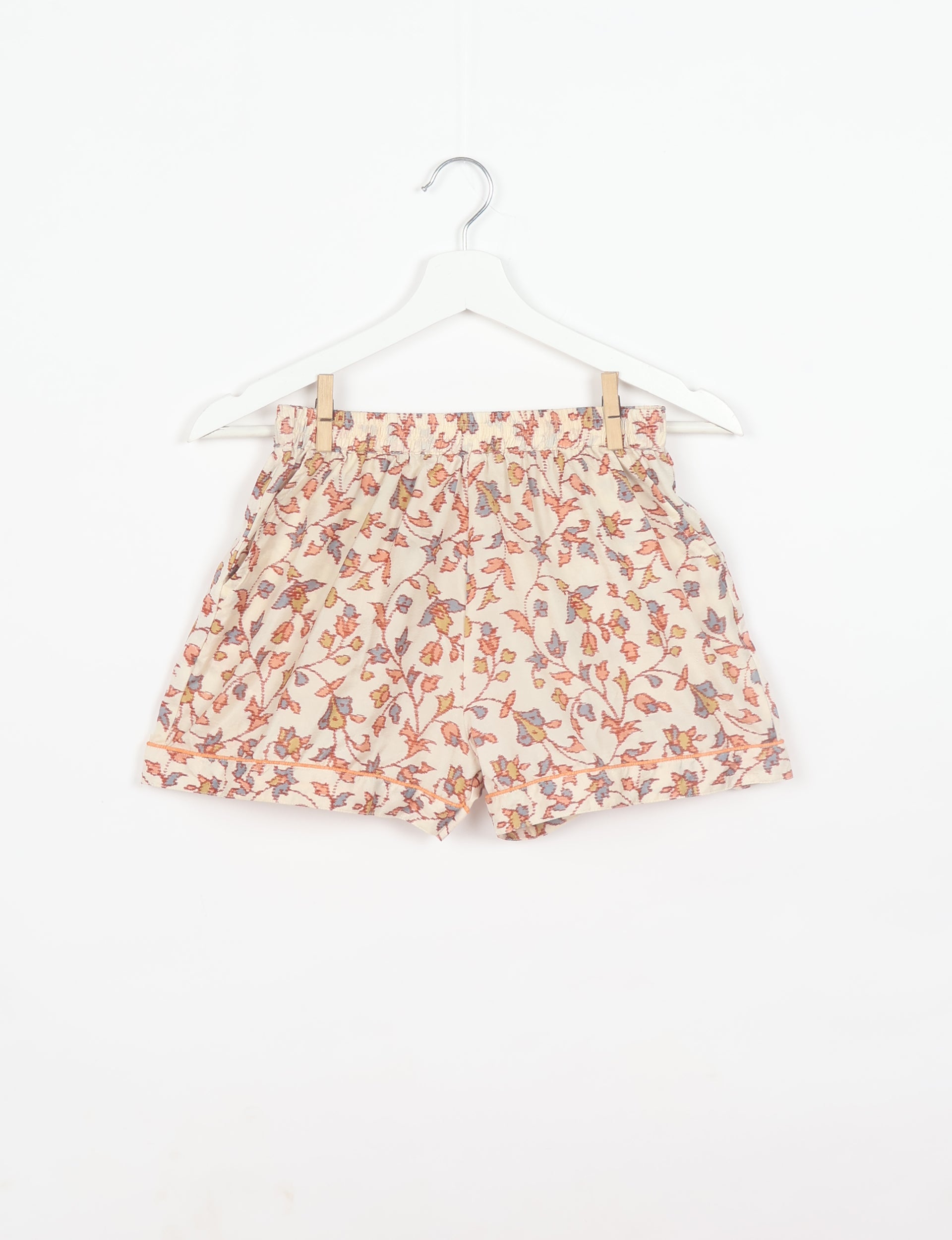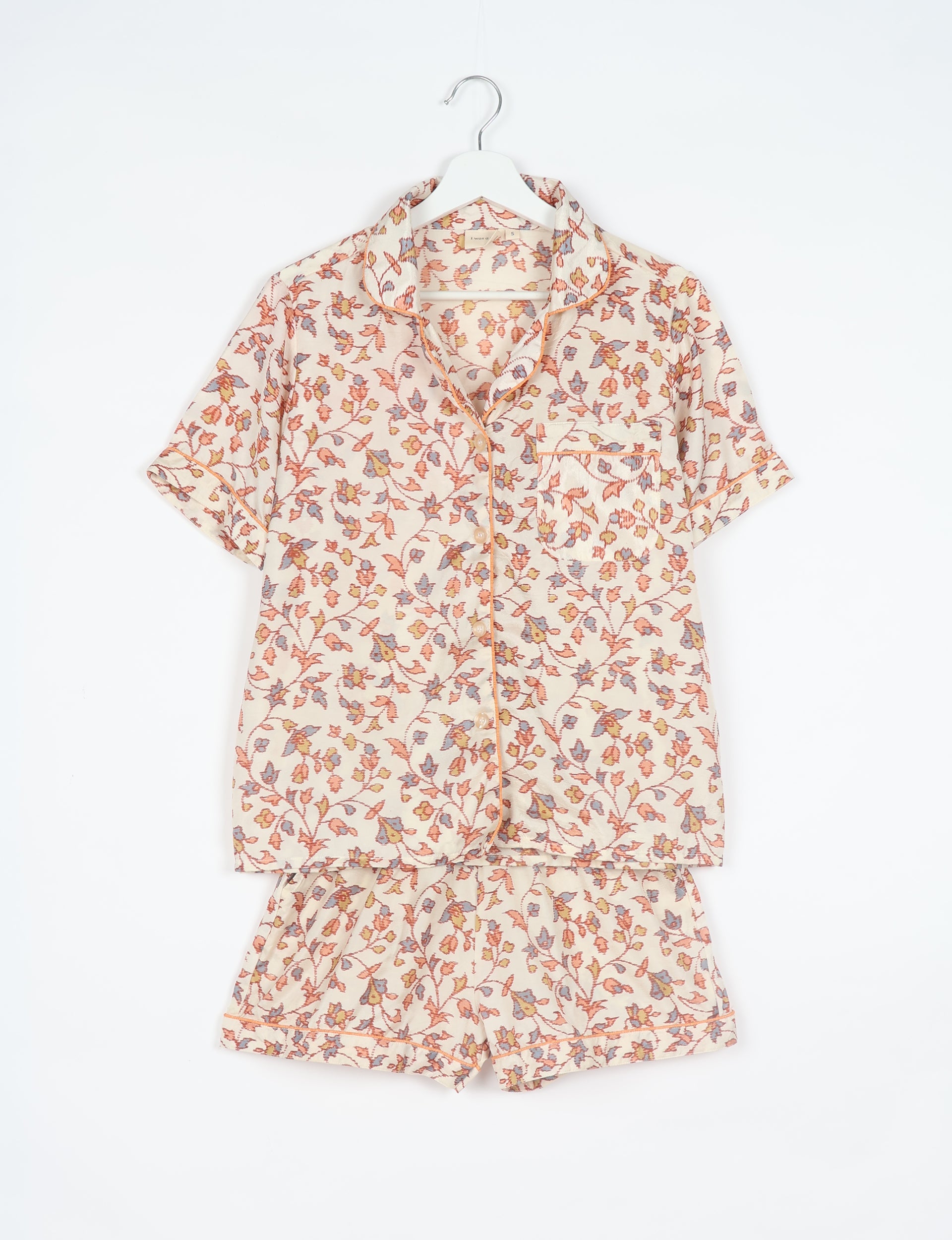 Two-piece nightwear set including a short-sleeved shirt and elasticated shorts. The shirt features a notched collar, front button closure with buttons, and a single chest pocket with contrast trim detail. The shorts have an elasticated waistband and contrast hem cuffs. Lighting and screens may cause slight variations in color appearance.
