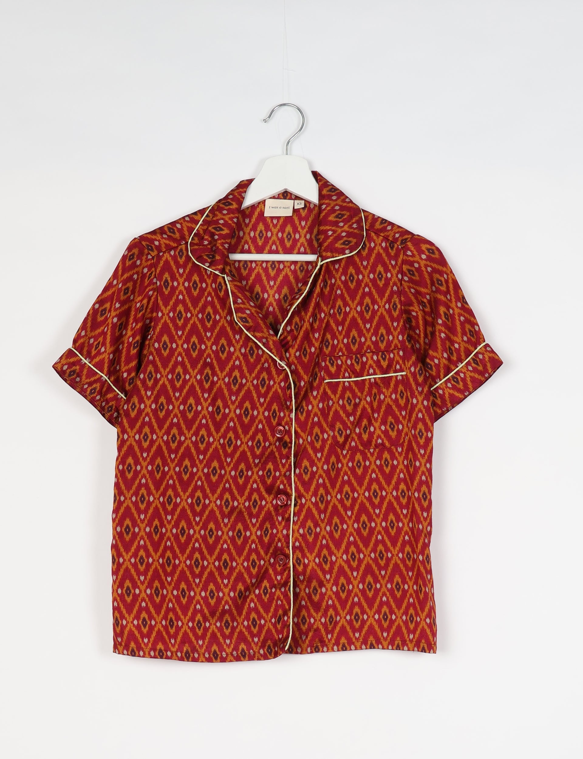 Two-piece nightwear set including a short-sleeved shirt and elasticated shorts. The shirt features a notched collar, front button closure with buttons, and a single chest pocket with contrast trim detail. The shorts have an elasticated waistband and contrast hem cuffs. Lighting and screens may cause slight variations in color appearance.