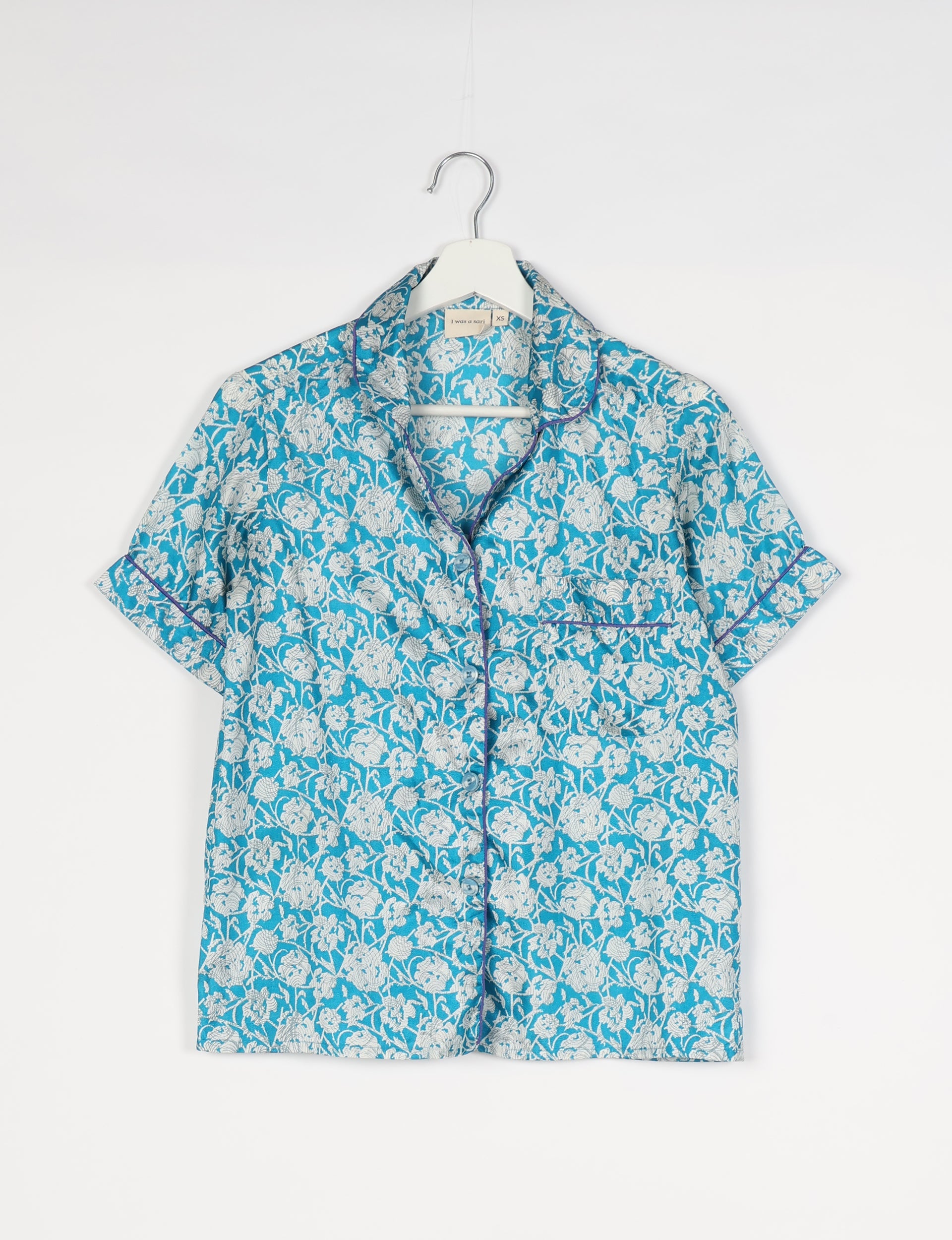 Two-piece nightwear set including a short-sleeved shirt and elasticated shorts. The shirt features a notched collar, front button closure with buttons, and a single chest pocket with contrast trim detail. The shorts have an elasticated waistband and contrast hem cuffs. Lighting and screens may cause slight variations in color appearance.