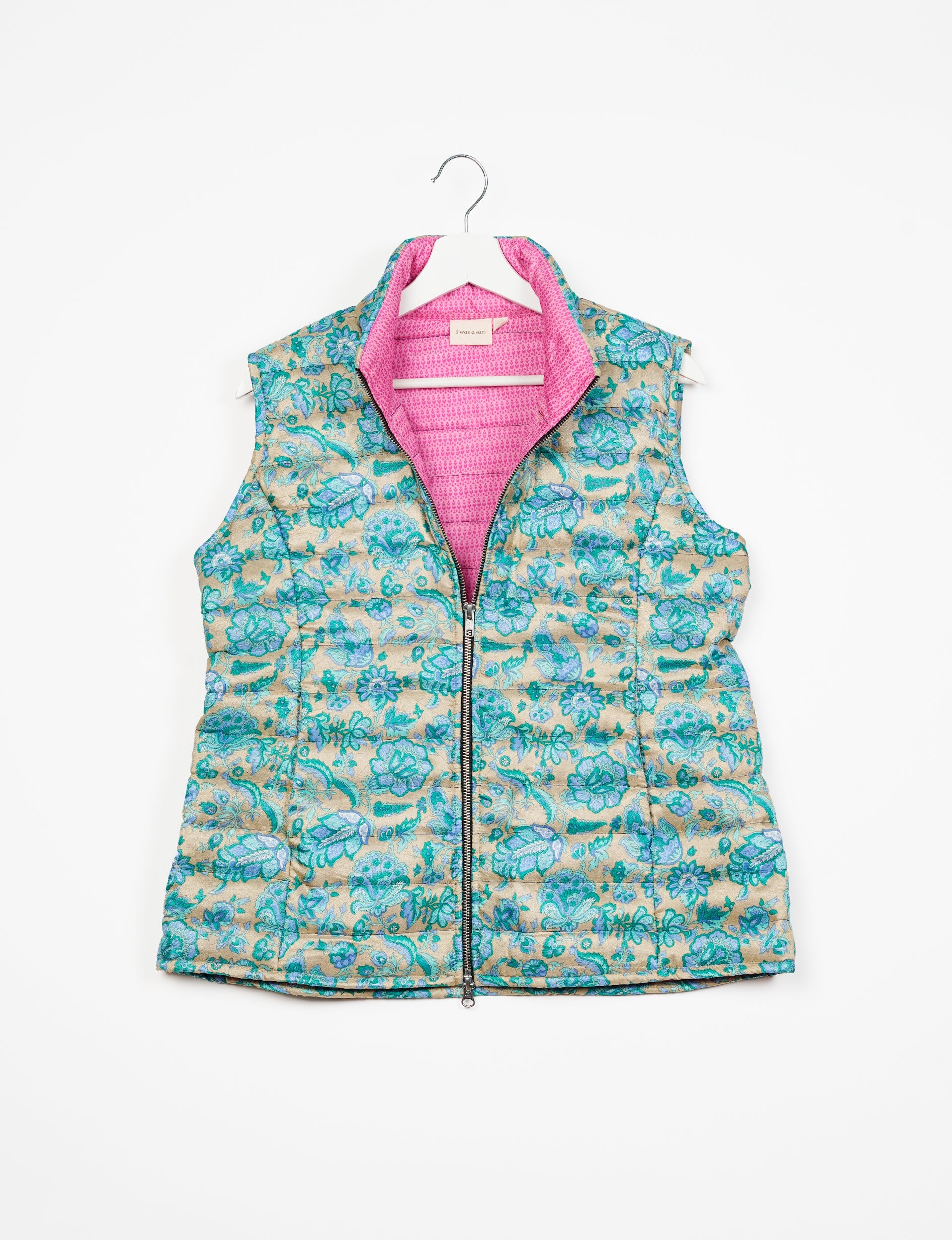 Sleeveless quilted gilet with high-neck stand collar and twin front zip closure. Features two front welt pockets, functional for light storage. The gilet has quilting throughout for warmth and structure, with polyfill padding and a contrast lining on the inside. The hem and armholes are finished with fabric binding for durability.