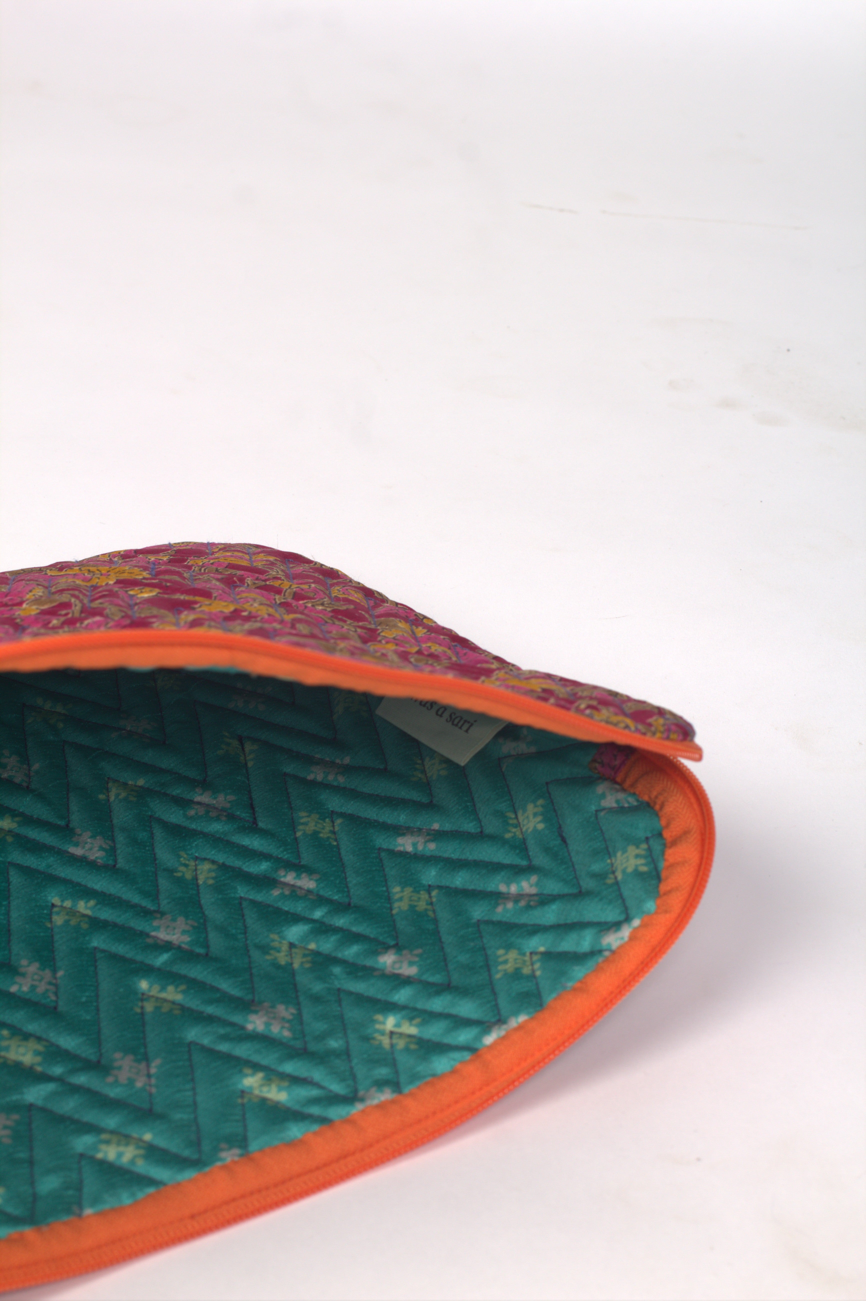 A padded sleeve with chevron quilted sari panels tailored to fit 15-16 inch laptops. The sleeve features a contrasting panel inside and a nylon coil zipper with metal puller for secure closure. Lighting and screens may cause slight variations in color appearance.