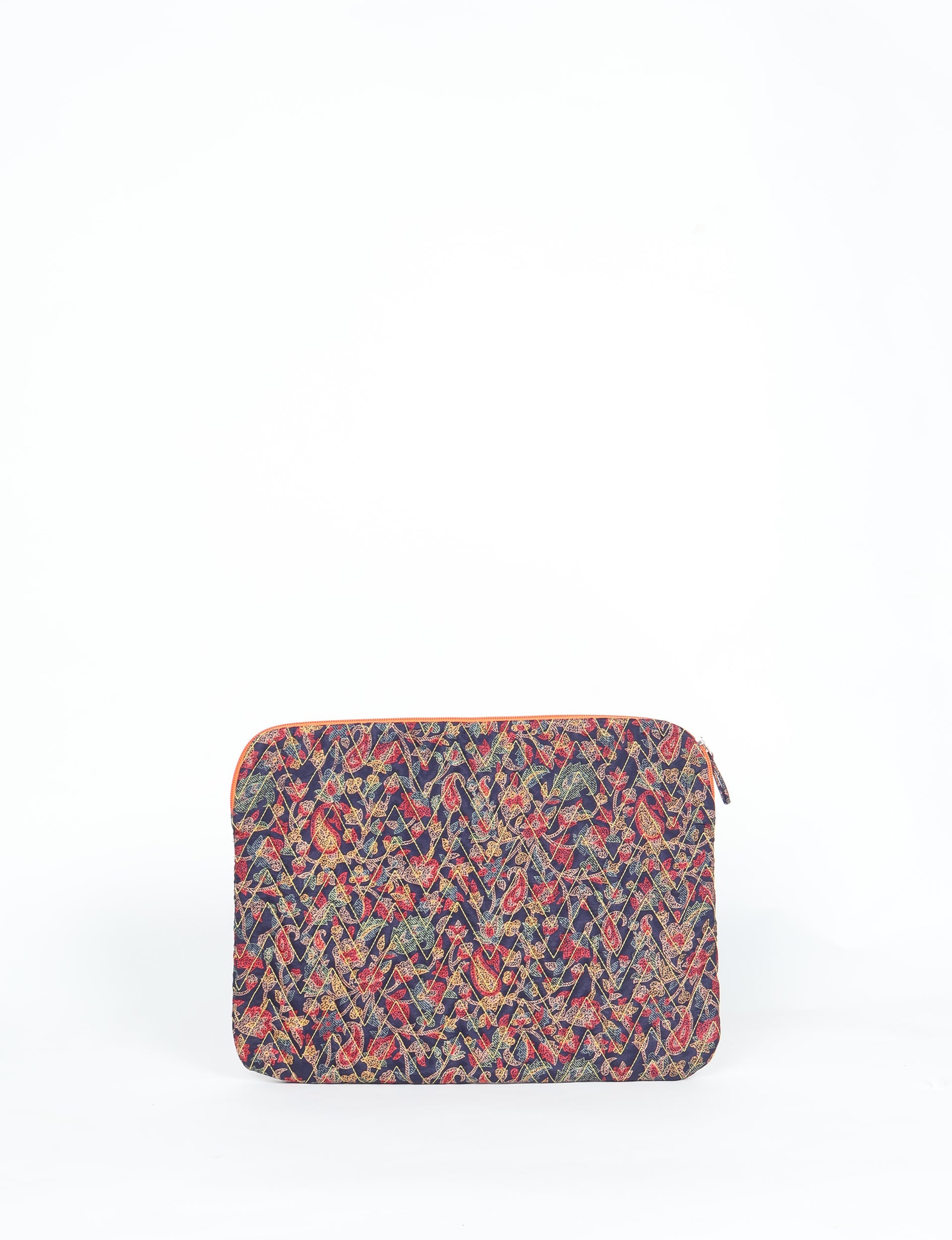 A padded sleeve with chevron quilted sari panels tailored to fit 15-16 inch laptops. The sleeve features a contrasting panel inside and a nylon coil zipper with metal puller for secure closure. Lighting and screens may cause slight variations in color appearance.