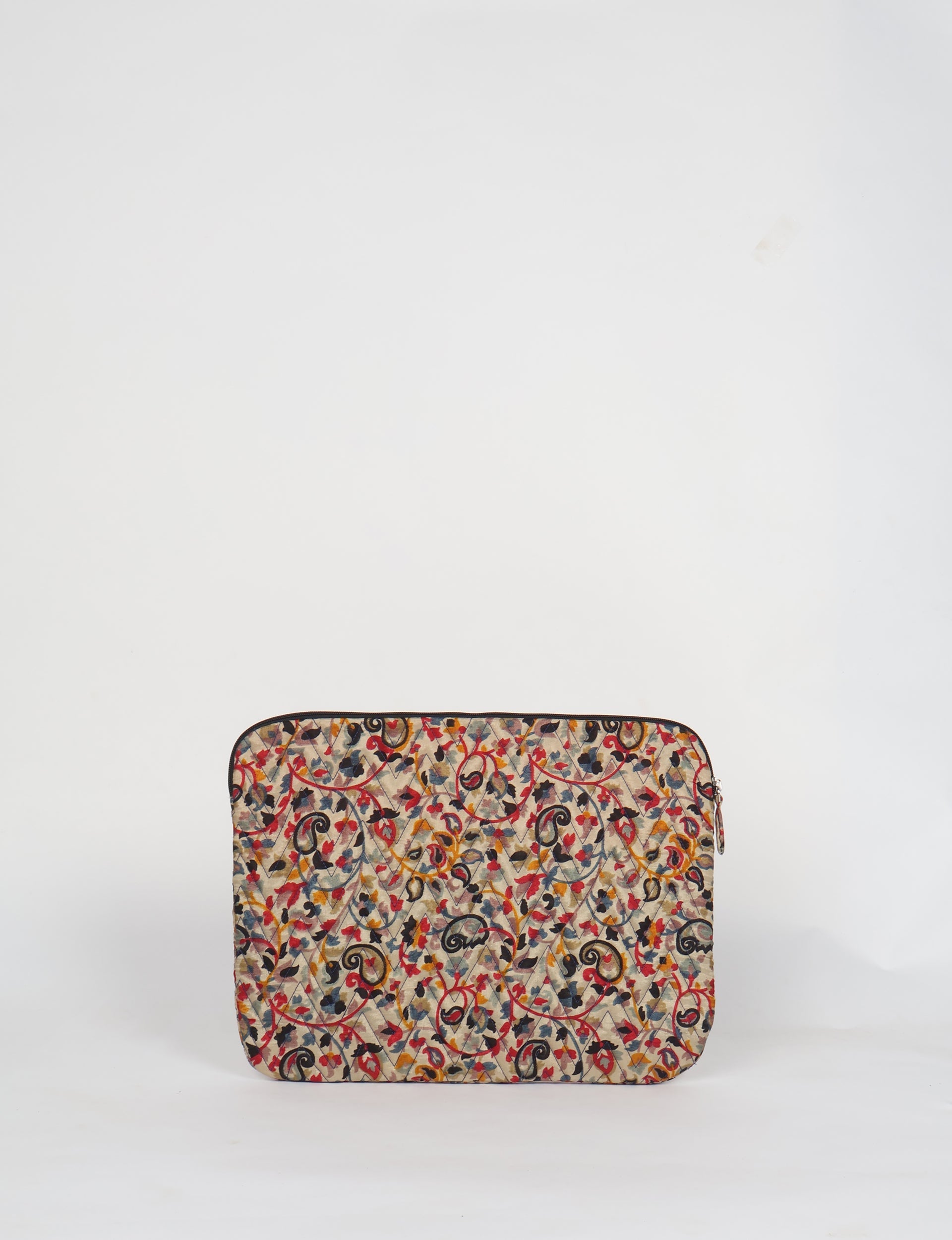 A padded sleeve with chevron quilted sari panels tailored to fit 15-16 inch laptops. The sleeve features a contrasting panel inside and a nylon coil zipper with metal puller for secure closure. Lighting and screens may cause slight variations in color appearance.
