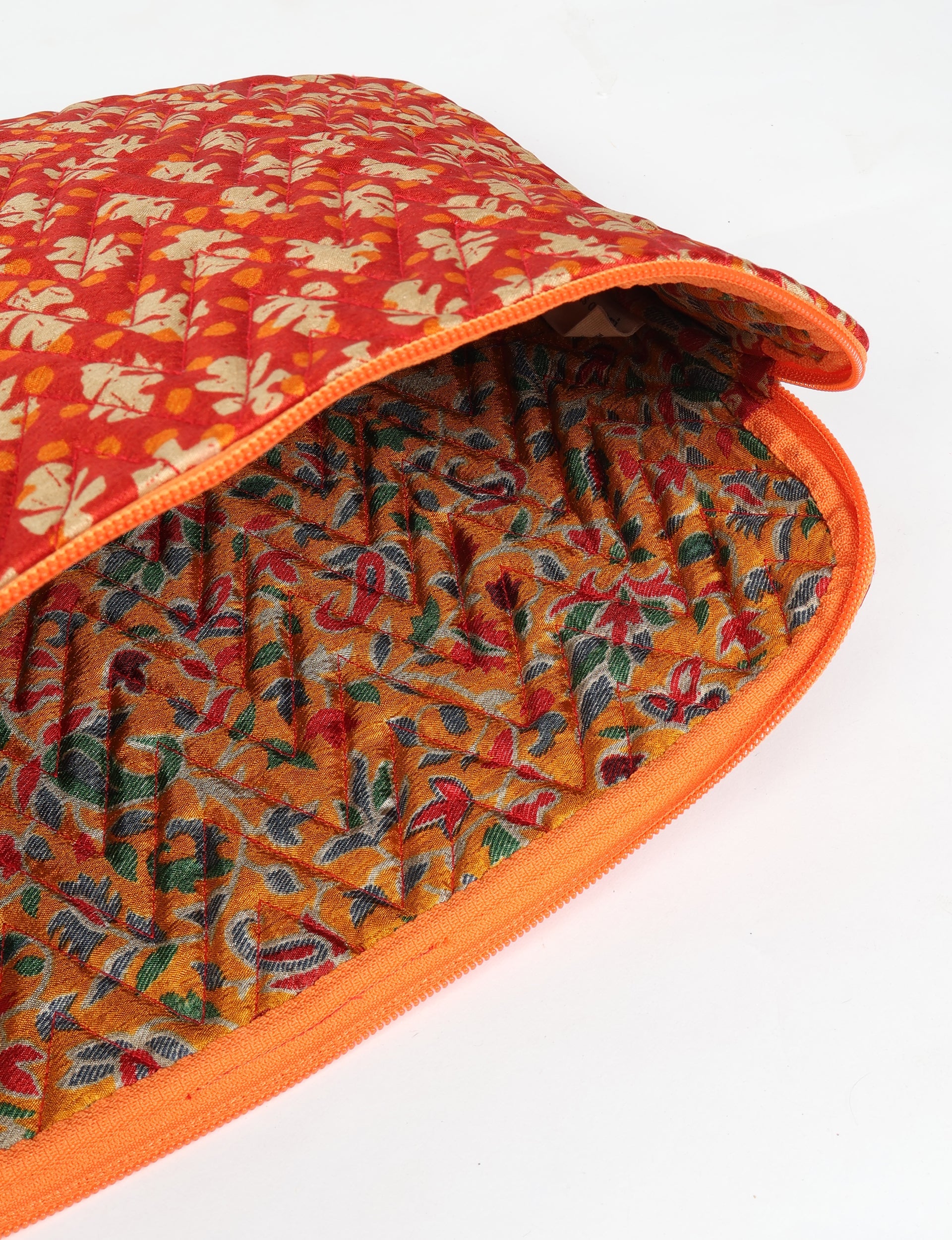 A padded sleeve with chevron quilted sari panels tailored to fit 15-16 inch laptops. The sleeve features a contrasting panel inside and a nylon coil zipper with metal puller for secure closure. Lighting and screens may cause slight variations in color appearance.
