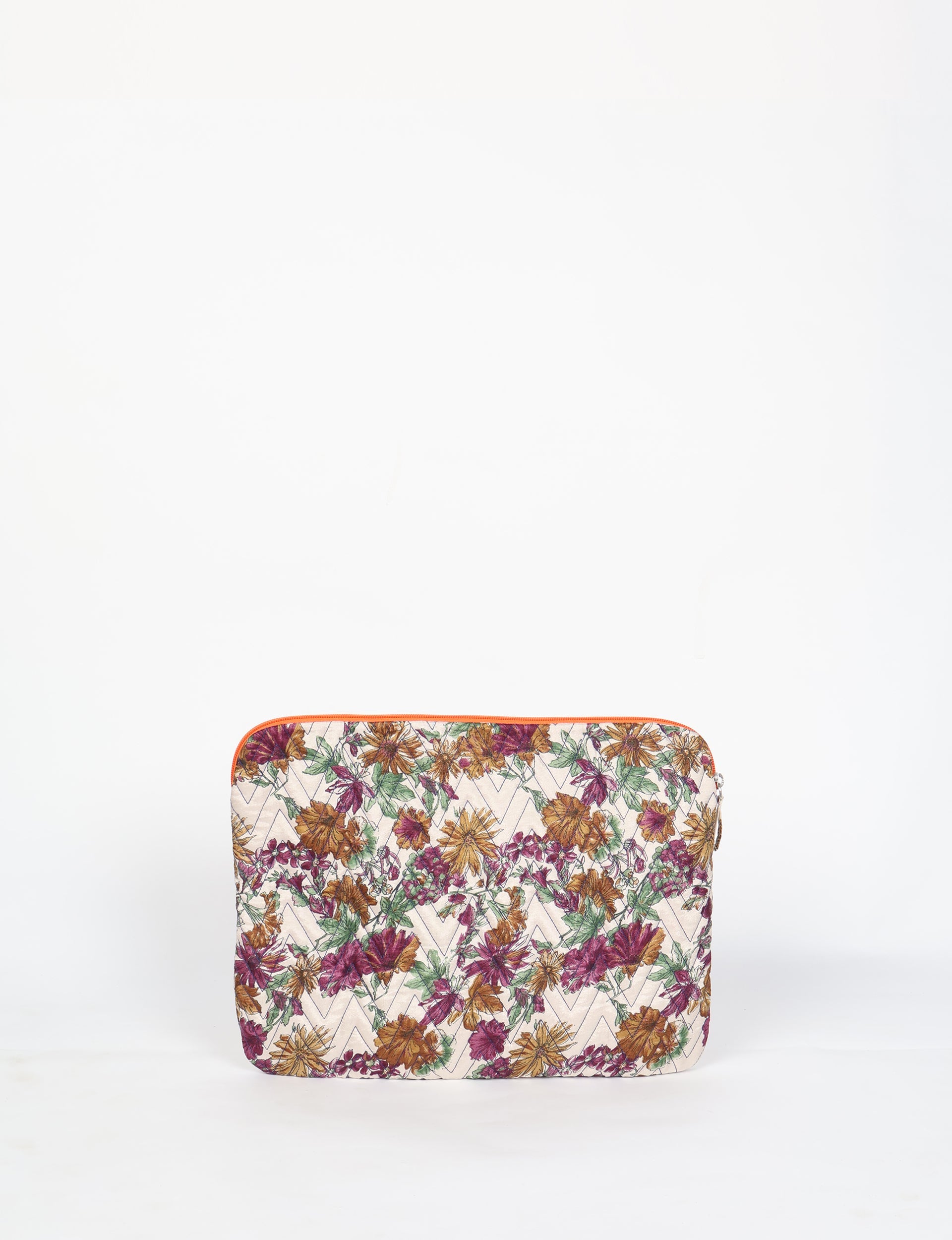A padded sleeve with chevron quilted sari panels tailored to fit 15-16 inch laptops. The sleeve features a contrasting panel inside and a nylon coil zipper with metal puller for secure closure. Lighting and screens may cause slight variations in color appearance.