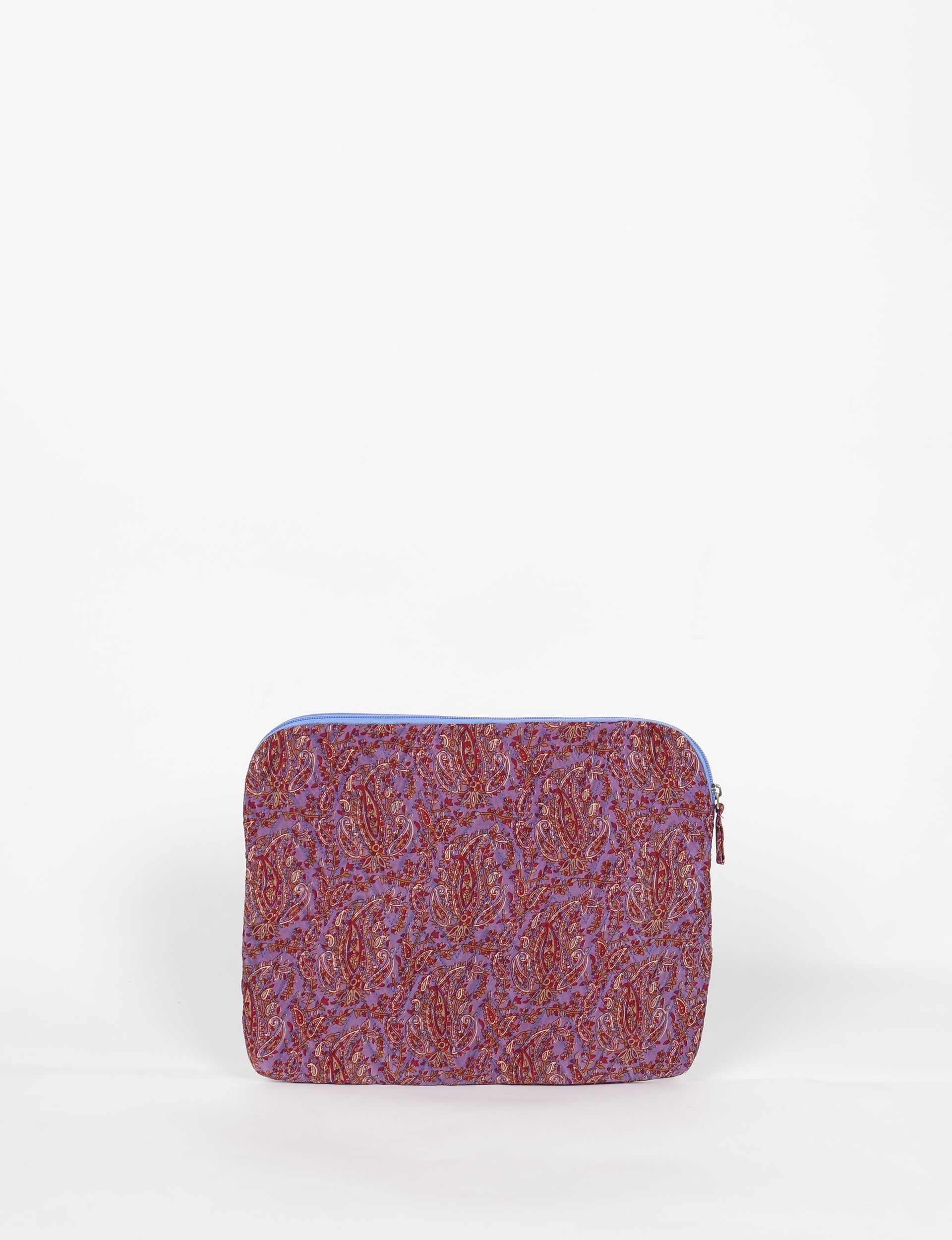 A padded sleeve with chevron quilted sari panels tailored to fit 15-16 inch laptops. The sleeve features a contrasting panel inside and a nylon coil zipper with metal puller for secure closure. Lighting and screens may cause slight variations in color appearance.