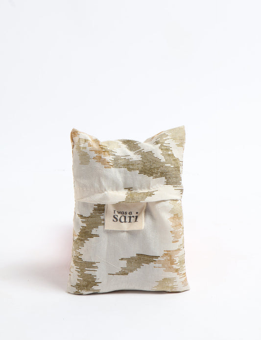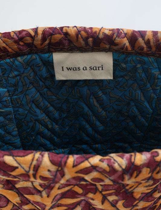 I'm not made from virgin fabrics and dyes, so my carbon footprint, pollution and water usage is way lower than other products. Instead, I'm made with circular production methods, from waste fabric which already existed. I turned into an I was a Sari instead of becoming landfill. Now I'm looking forward to my second life, maybe with you.