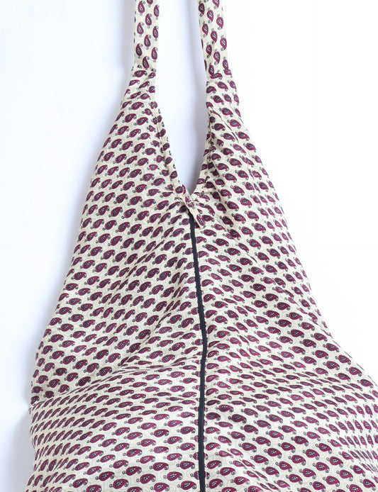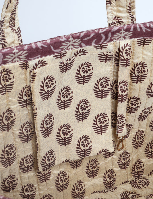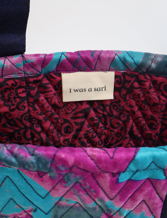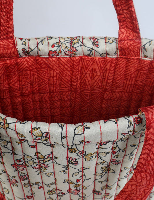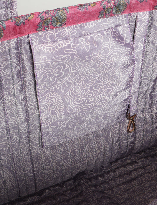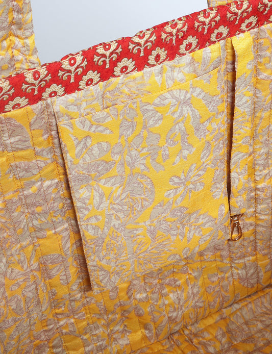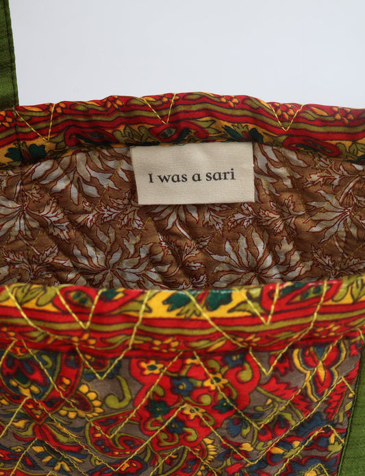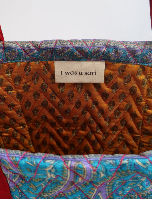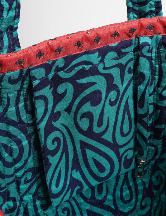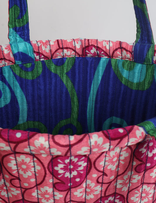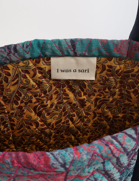 A classic shopper bag designed with quilted panels, with contrastic sari fabric on the inside . Features medium-length handles, a simple rectangular body with ample space and cushioning. Lighting and screens may cause slight variations in color appearance.