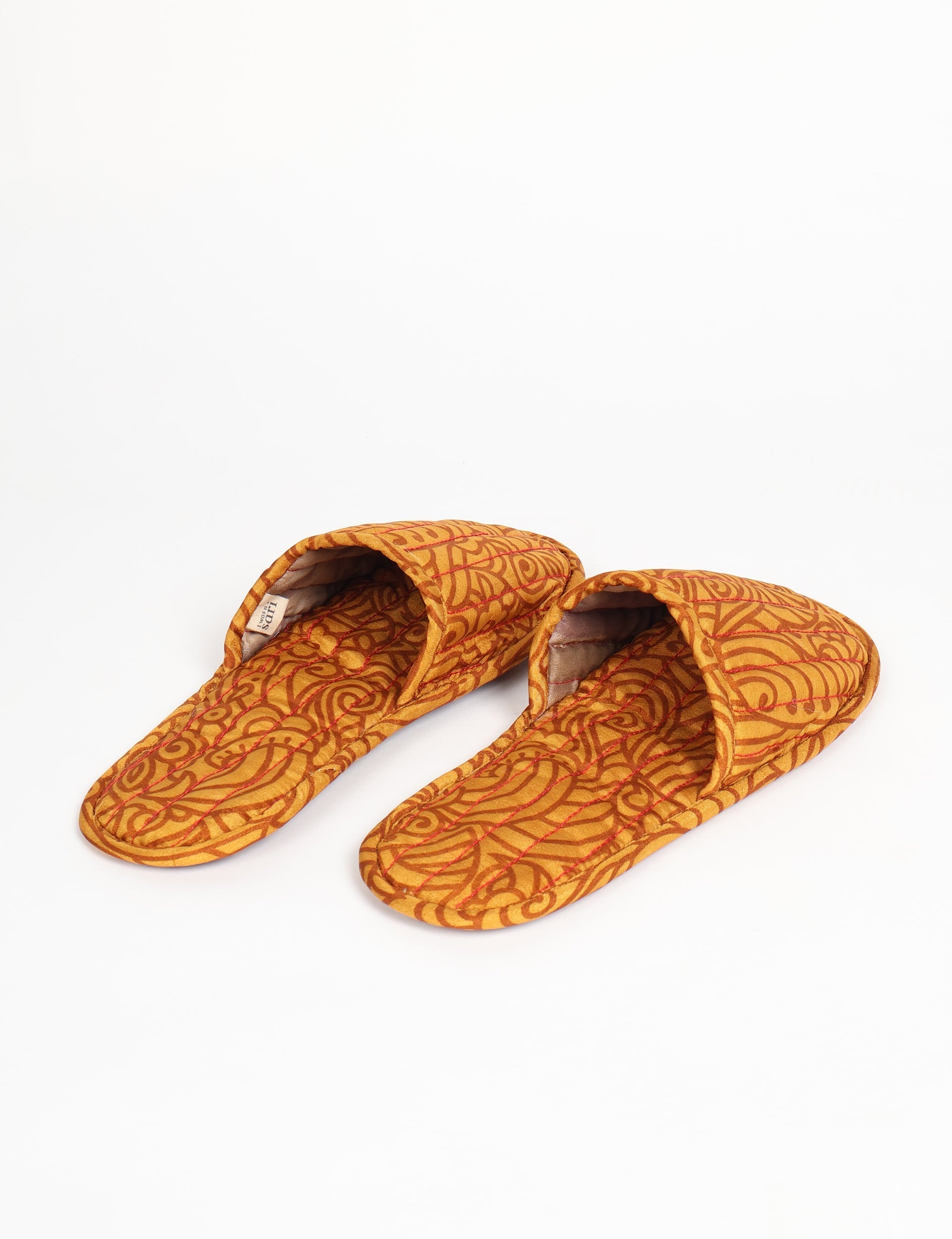 Soft fabric slippers with a quilted finish and cushioned sole for comfort. Designed with a closed-toe front and open back for easy slip-on use. Suitable for indoor wear, providing warmth and light padding underfoot.