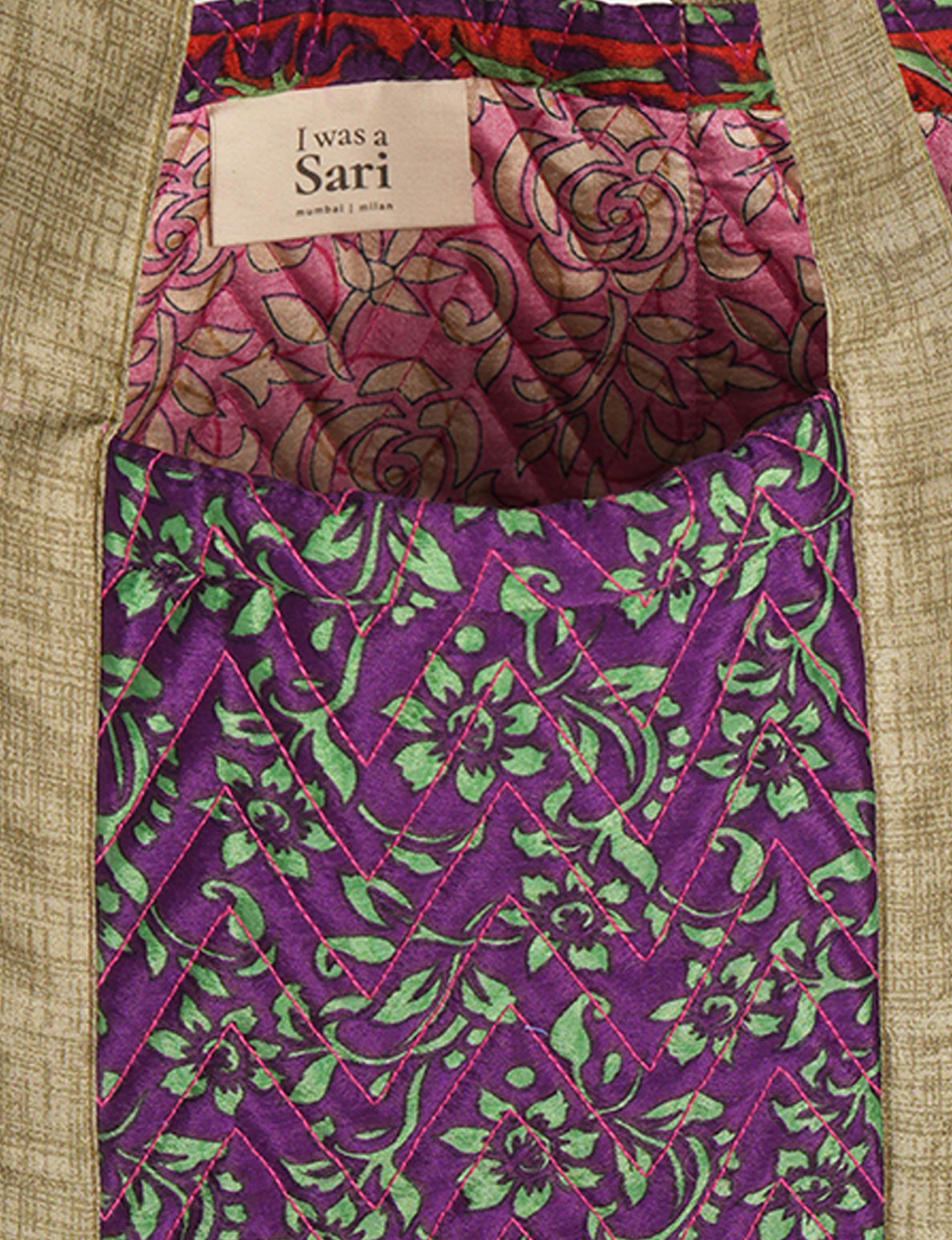 I'm not made from virgin fabrics and dyes, so my carbon footprint, pollution and water usage is way lower than other products. Instead, I'm made with circular production methods, from waste fabric which already existed. I turned into an I was a Sari instead of becoming landfill. Now I'm looking forward to my second life, maybe with you.