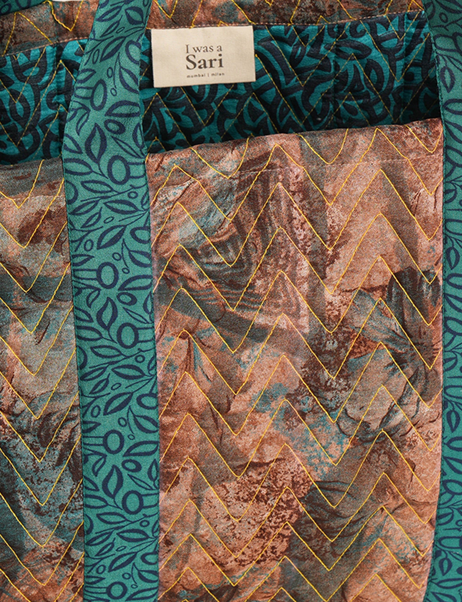 I'm not made from virgin fabrics and dyes, so my carbon footprint, pollution and water usage is way lower than other products. Instead, I'm made with circular production methods, from waste fabric which already existed. I turned into an I was a Sari instead of becoming landfill. Now I'm looking forward to my second life, maybe with you.