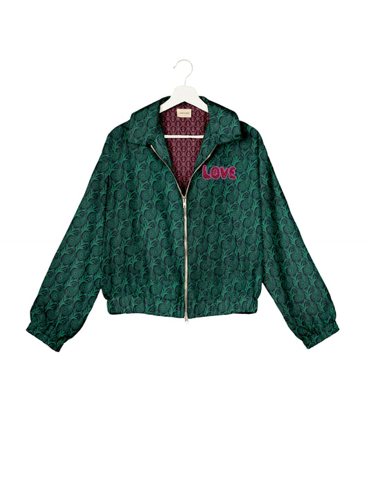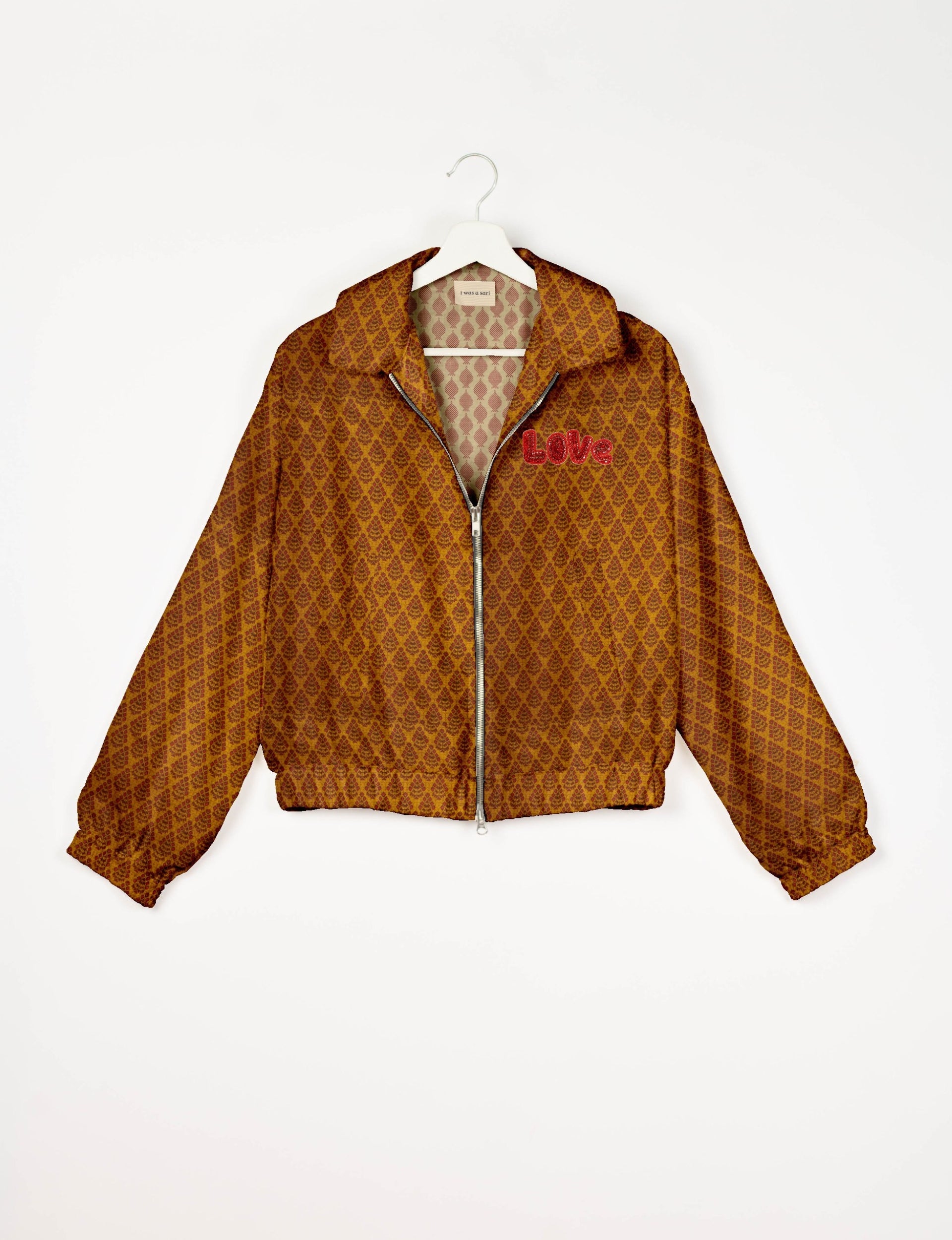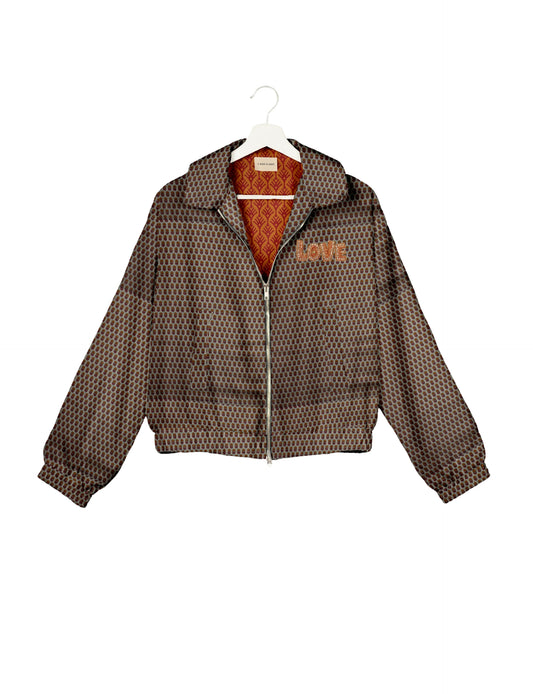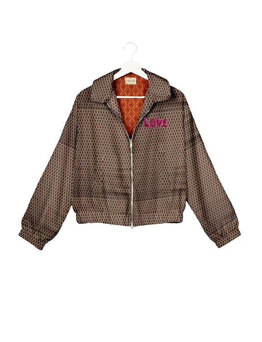 A special edition of the Classic Bomber , elevated with intricate handcrafted Aari embroidery that spells out "Love". And by our female artisans no less. Crafted from upcycled saris, this jacket is more than just a statement piece—it's a wearable story of artistry, tradition, and conscious living.