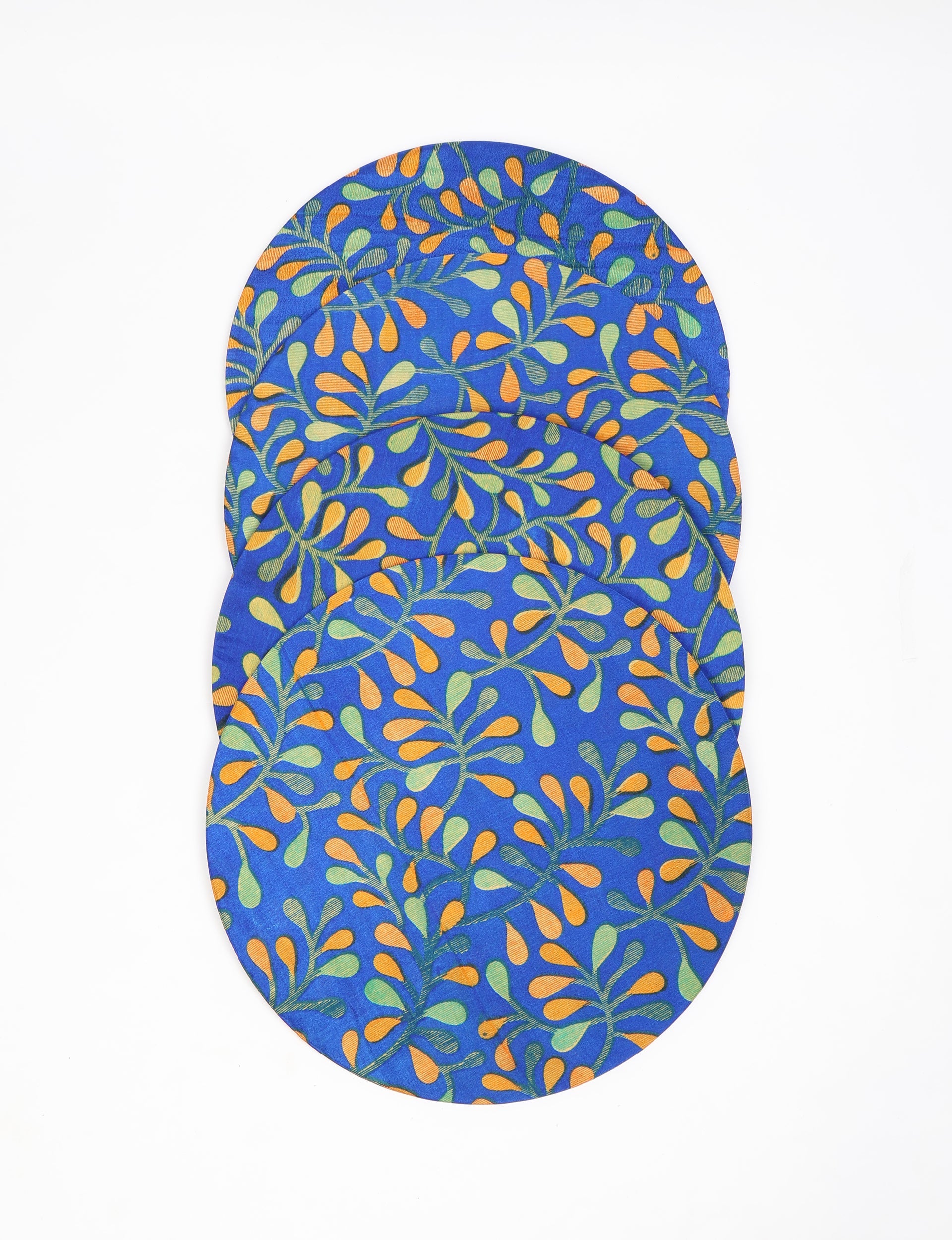 Set of four circular placemats with 3 mm MDF core and removable fabric sleeves. Sleeves are elasticated, washable, and replaceable. Suitable for table place settings or serving dishes. Lighting and screens may cause slight variations in color appearance.