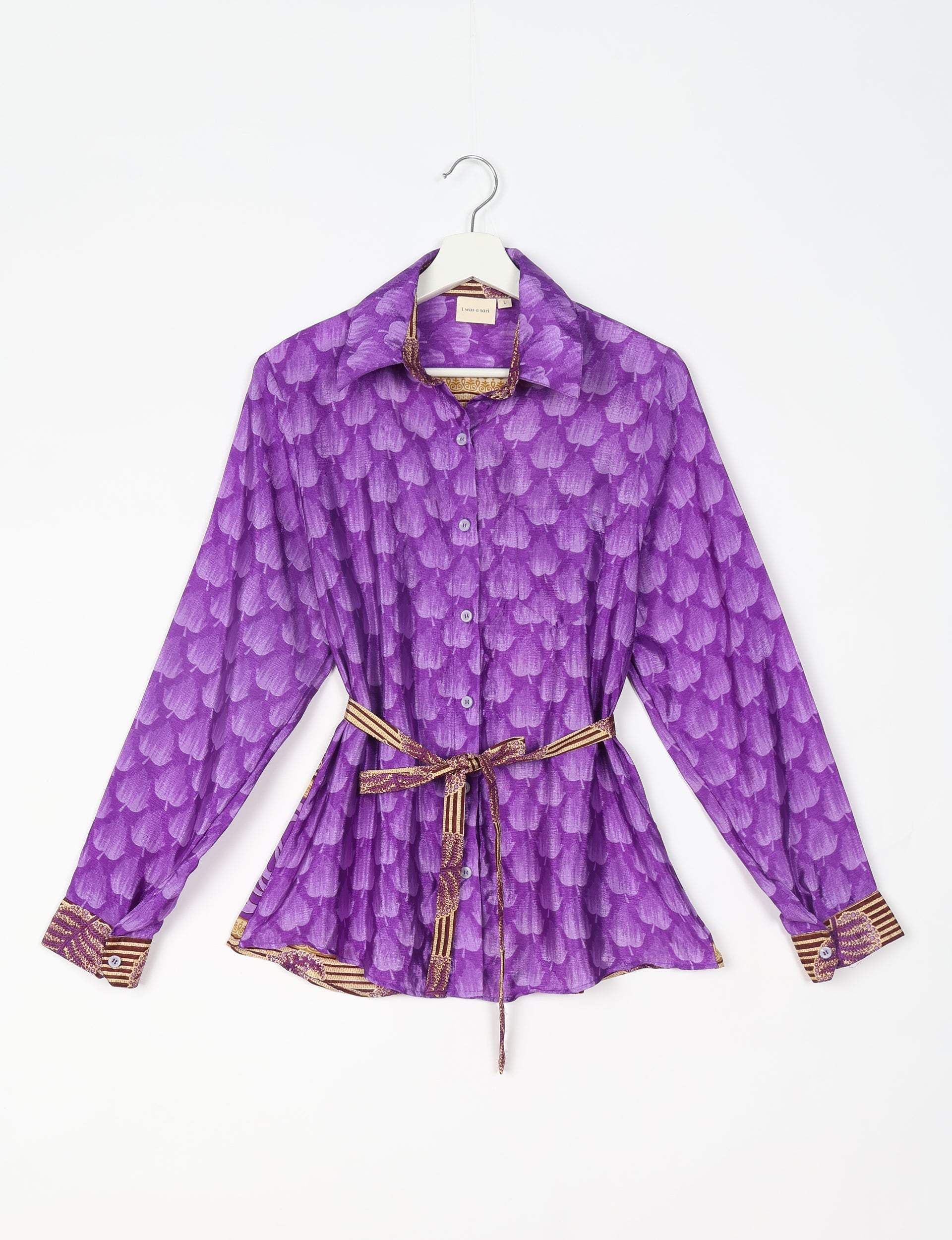 A slim-fit, long-sleeve shirt featuring a semi-spread collar and front button-down closure and a front pocket. It is constructed with standard shirt cuffs finished with button fastenings. The shirt includes a detachable self-fabric belt that can be styled at the waist or worn as a neck tie.