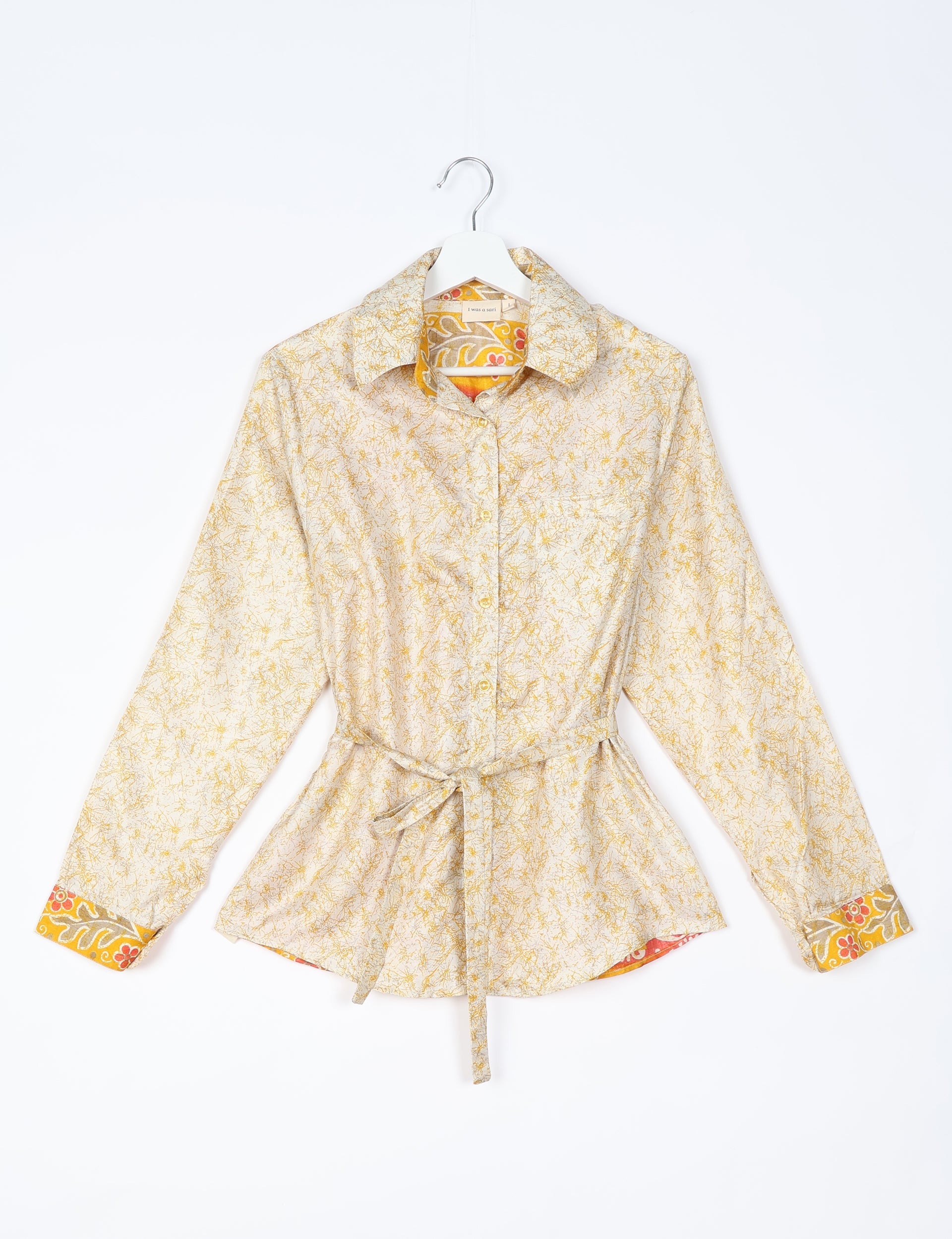 A slim-fit, long-sleeve shirt featuring a semi-spread collar and front button-down closure and a front pocket. It is constructed with standard shirt cuffs finished with button fastenings. The shirt includes a detachable self-fabric belt that can be styled at the waist or worn as a neck tie.