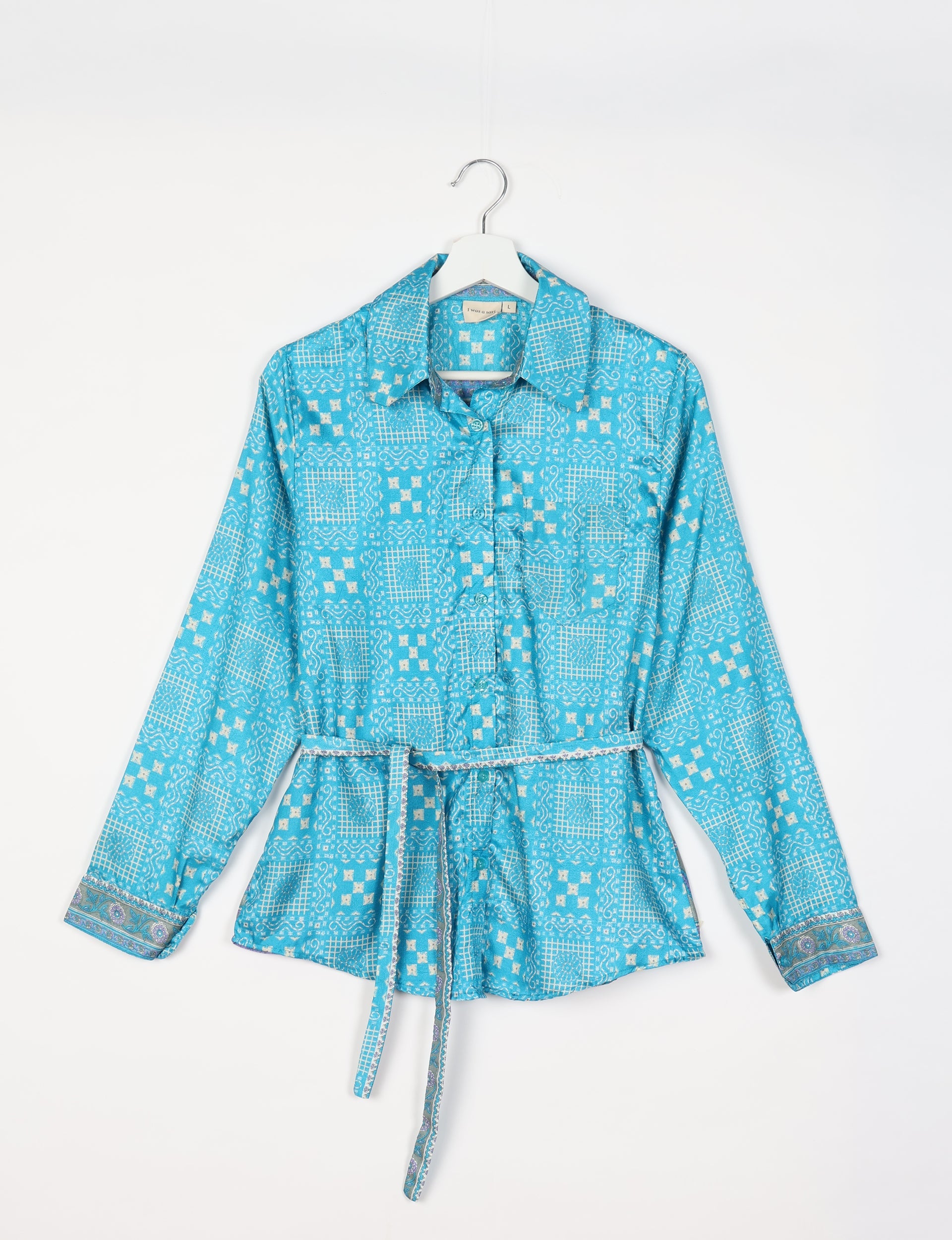 A slim-fit, long-sleeve shirt featuring a semi-spread collar and front button-down closure and a front pocket. It is constructed with standard shirt cuffs finished with button fastenings. The shirt includes a detachable self-fabric belt that can be styled at the waist or worn as a neck tie.