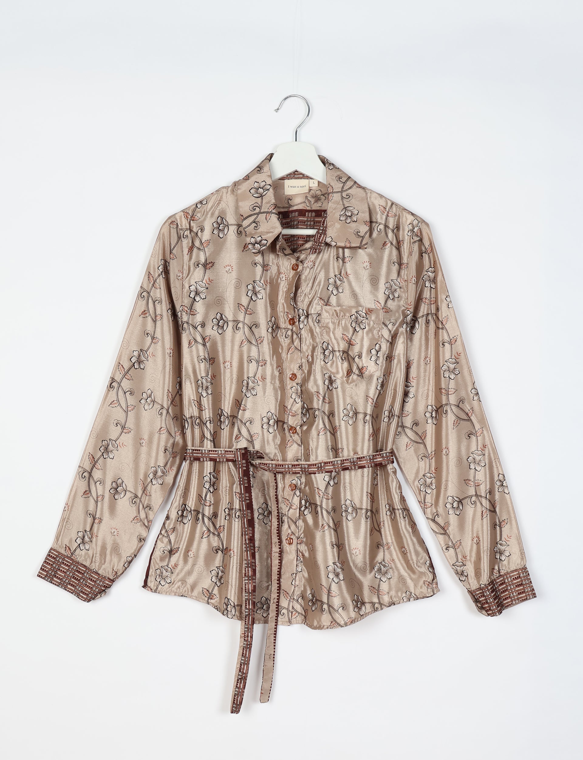 A slim-fit, long-sleeve shirt featuring a semi-spread collar and front button-down closure and a front pocket. It is constructed with standard shirt cuffs finished with button fastenings. The shirt includes a detachable self-fabric belt that can be styled at the waist or worn as a neck tie.