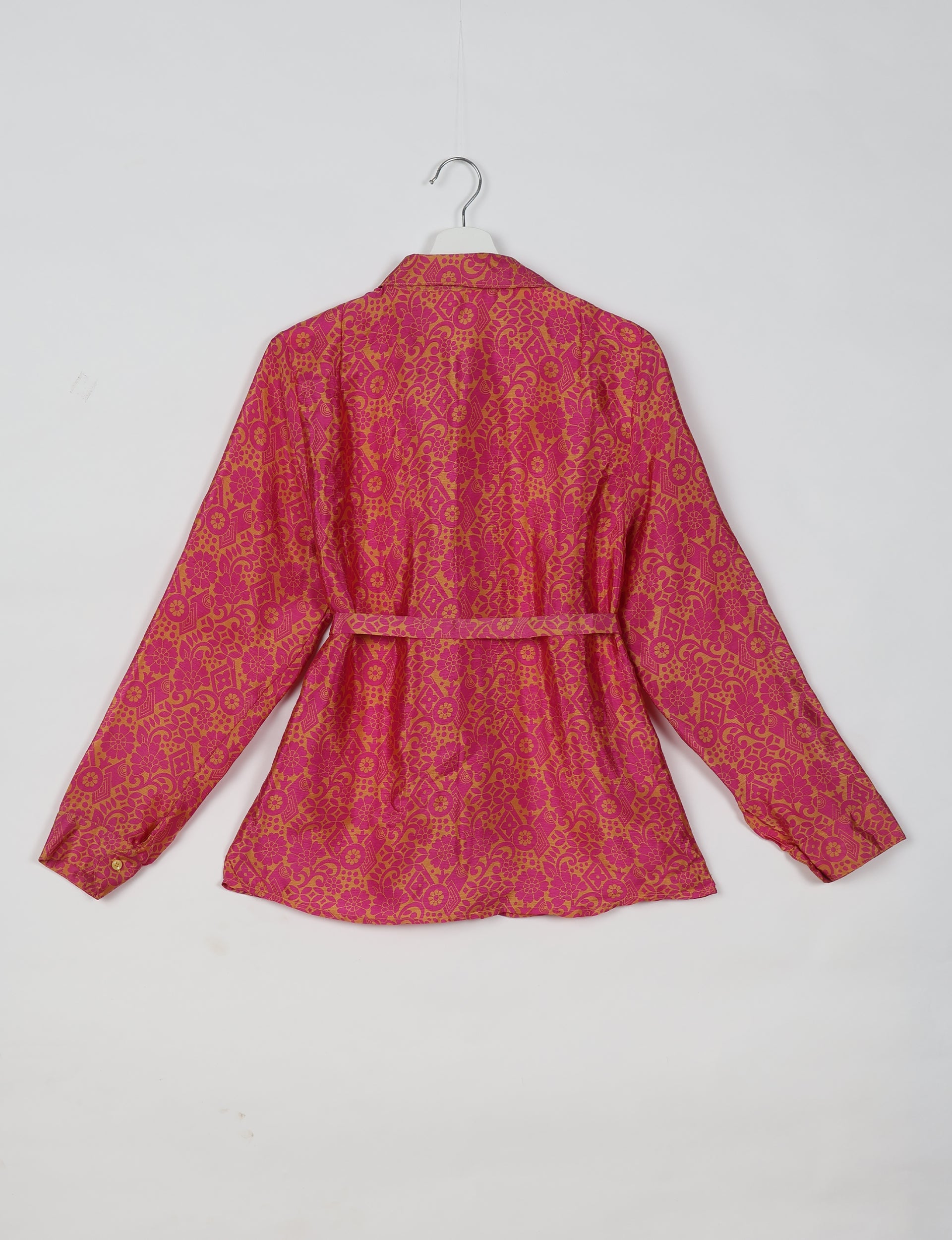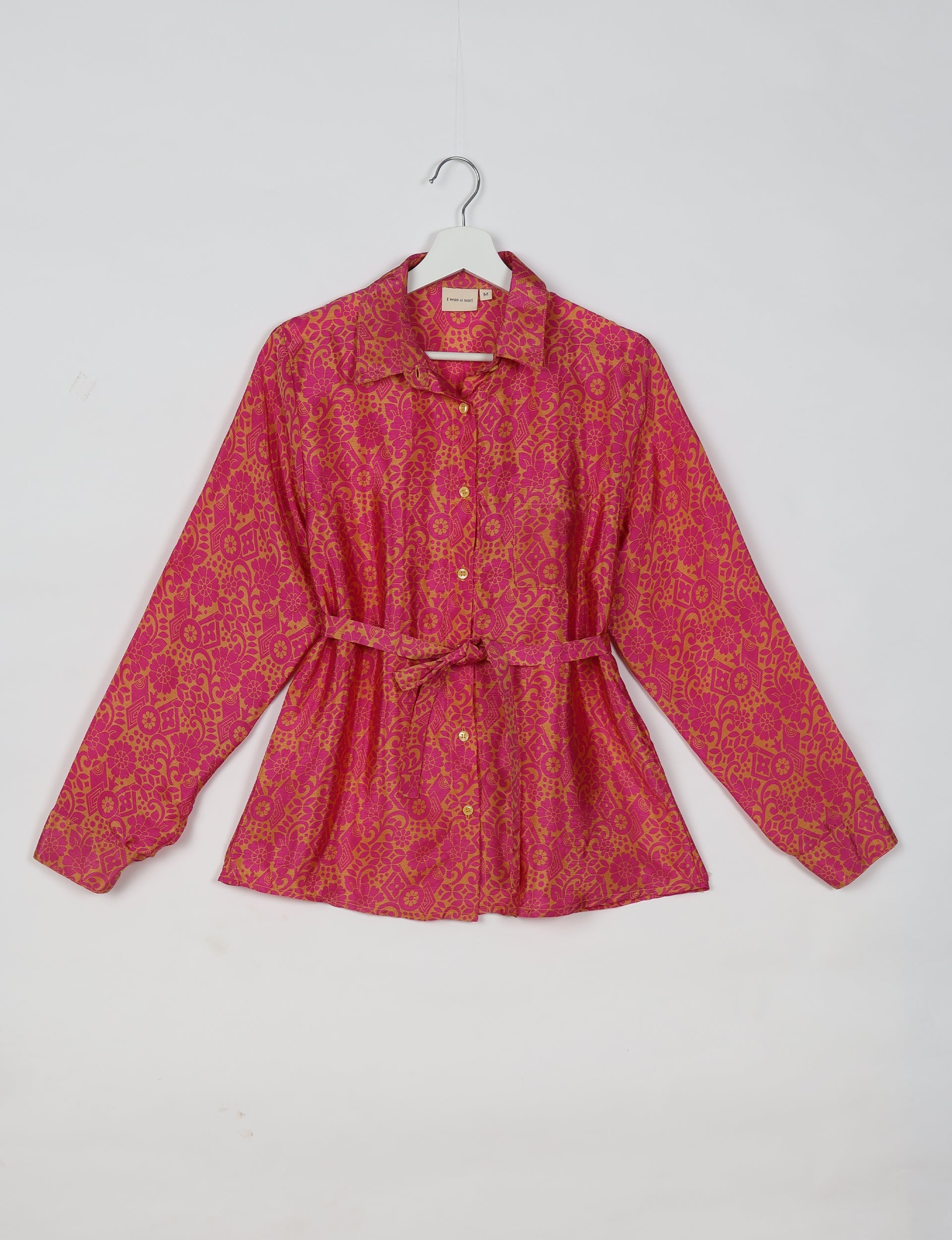 A slim-fit, long-sleeve shirt featuring a semi-spread collar and front button-down closure and a front pocket. It is constructed with standard shirt cuffs finished with button fastenings. The shirt includes a detachable self-fabric belt that can be styled at the waist or worn as a neck tie.