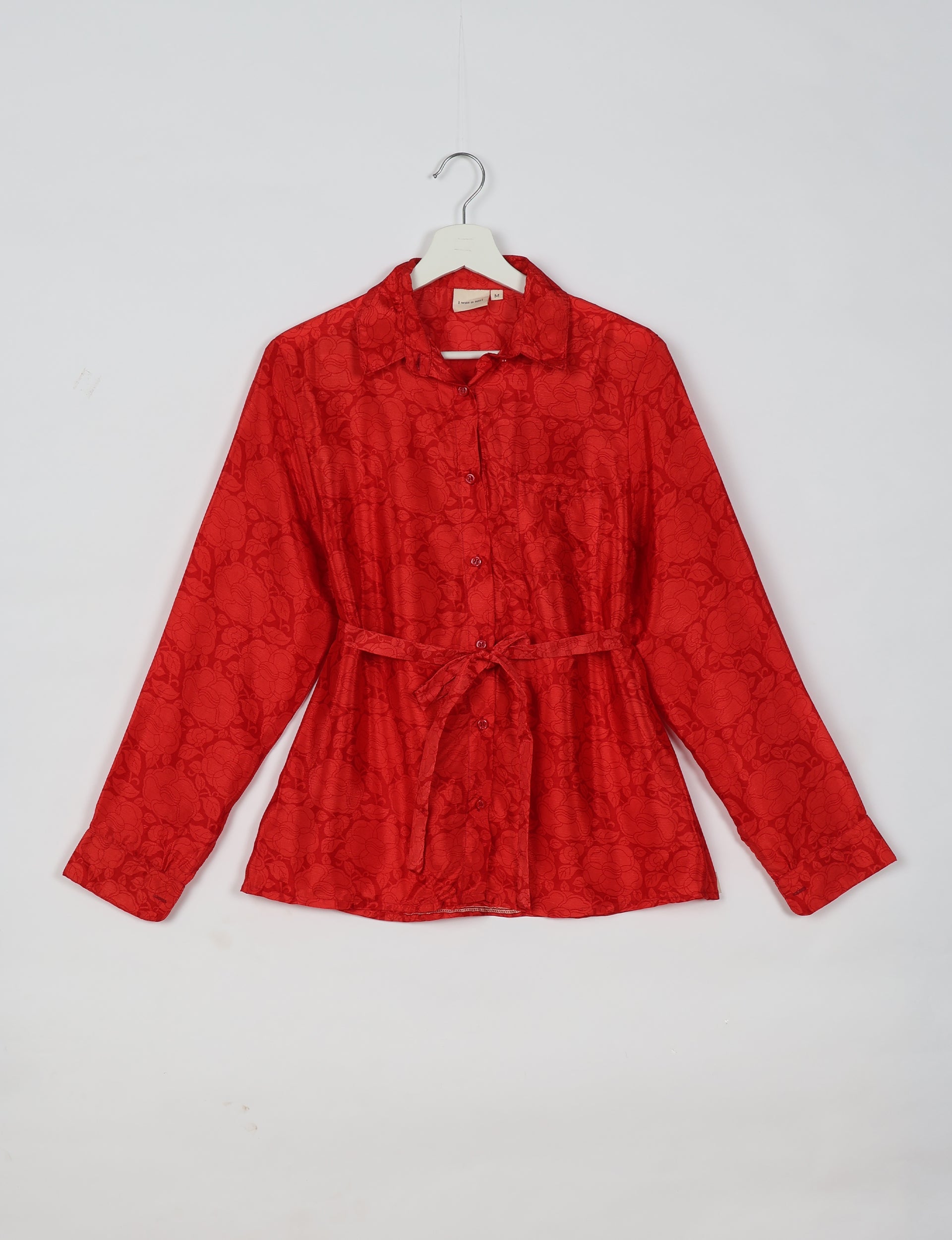 A slim-fit, long-sleeve shirt featuring a semi-spread collar and front button-down closure and a front pocket. It is constructed with standard shirt cuffs finished with button fastenings. The shirt includes a detachable self-fabric belt that can be styled at the waist or worn as a neck tie.