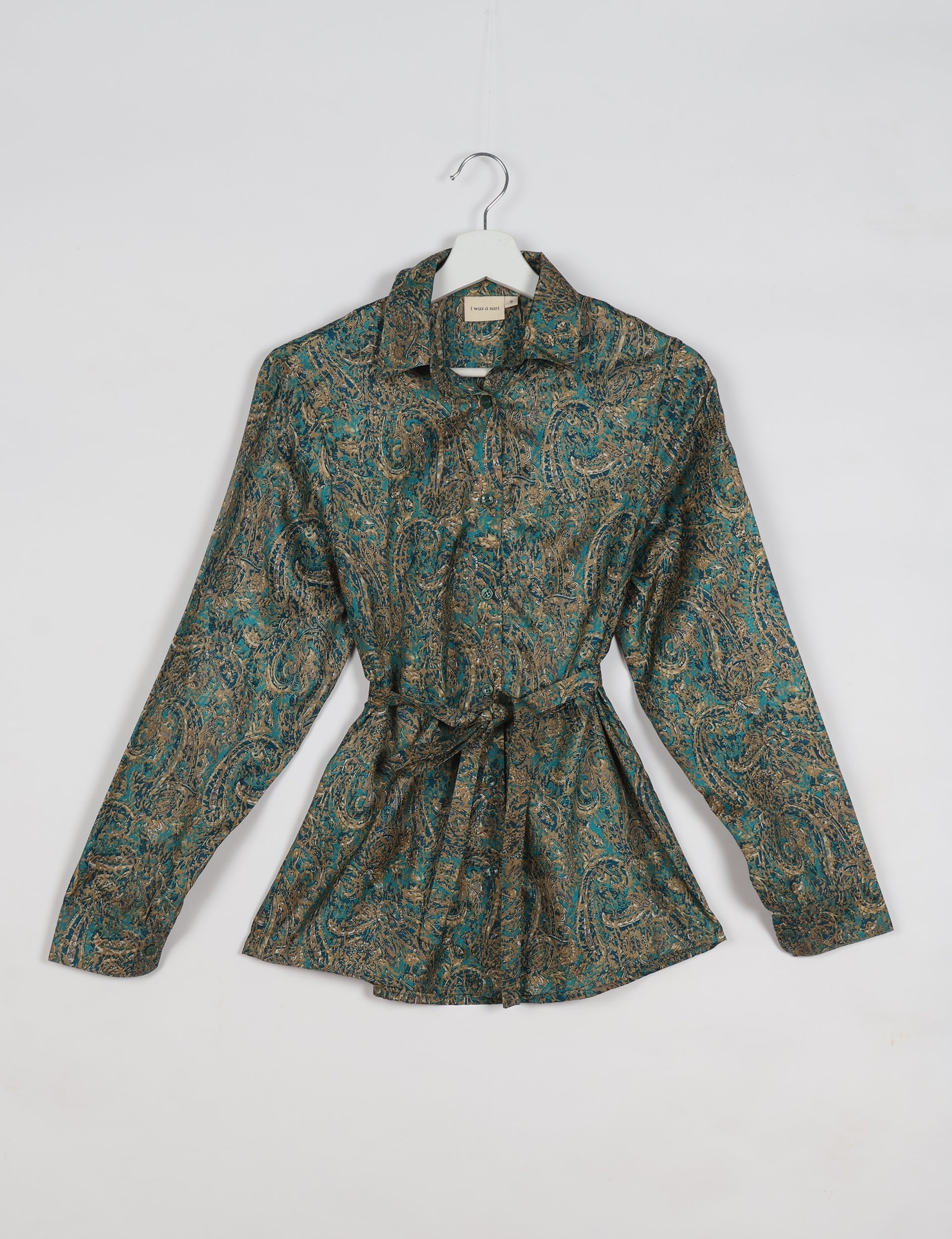 A slim-fit, long-sleeve shirt featuring a semi-spread collar and front button-down closure and a front pocket. It is constructed with standard shirt cuffs finished with button fastenings. The shirt includes a detachable self-fabric belt that can be styled at the waist or worn as a neck tie.