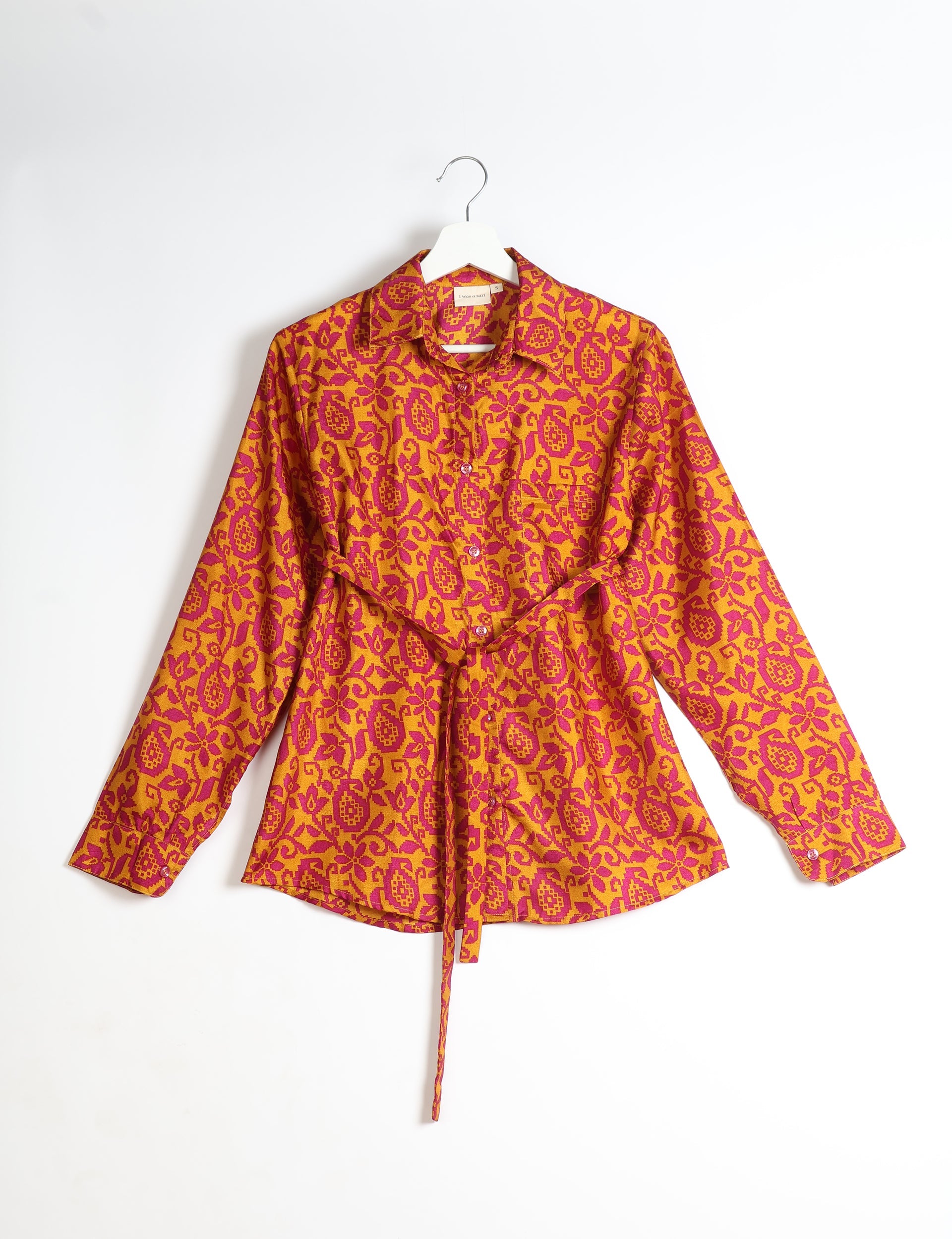 A slim-fit, long-sleeve shirt featuring a semi-spread collar and front button-down closure and a front pocket. It is constructed with standard shirt cuffs finished with button fastenings. The shirt includes a detachable self-fabric belt that can be styled at the waist or worn as a neck tie.