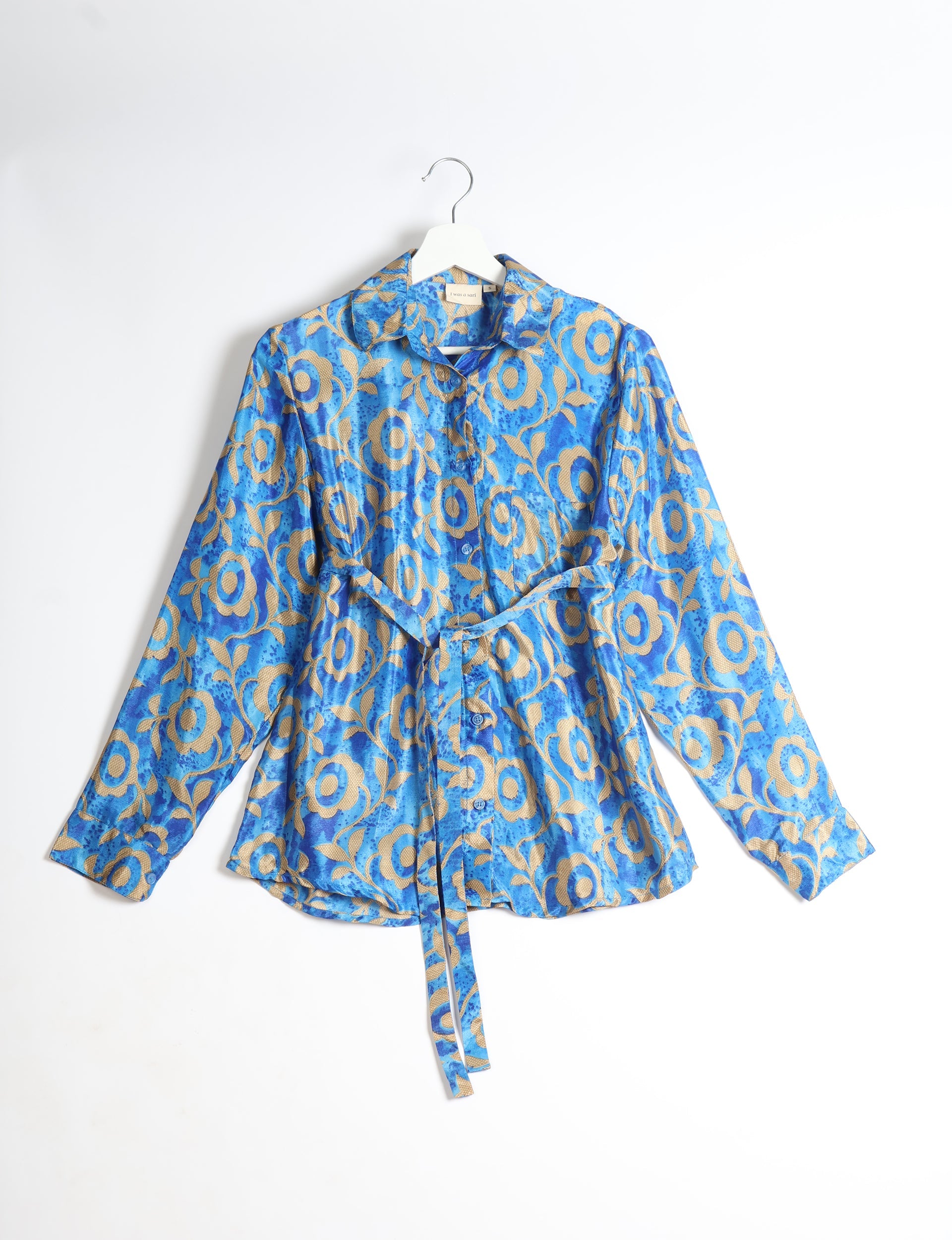 A slim-fit, long-sleeve shirt featuring a semi-spread collar and front button-down closure and a front pocket. It is constructed with standard shirt cuffs finished with button fastenings. The shirt includes a detachable self-fabric belt that can be styled at the waist or worn as a neck tie.