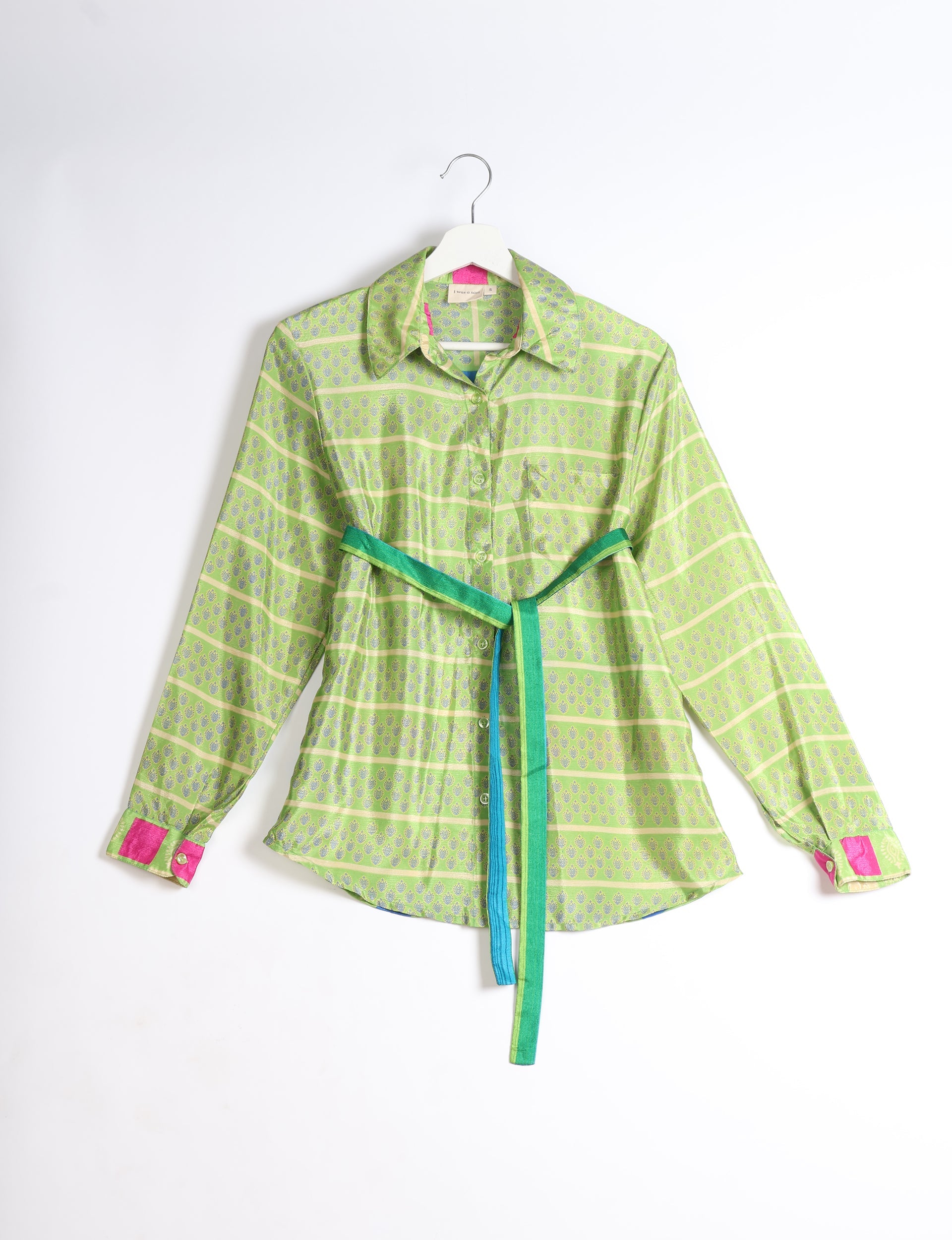 A slim-fit, long-sleeve shirt featuring a semi-spread collar and front button-down closure and a front pocket. It is constructed with standard shirt cuffs finished with button fastenings. The shirt includes a detachable self-fabric belt that can be styled at the waist or worn as a neck tie.