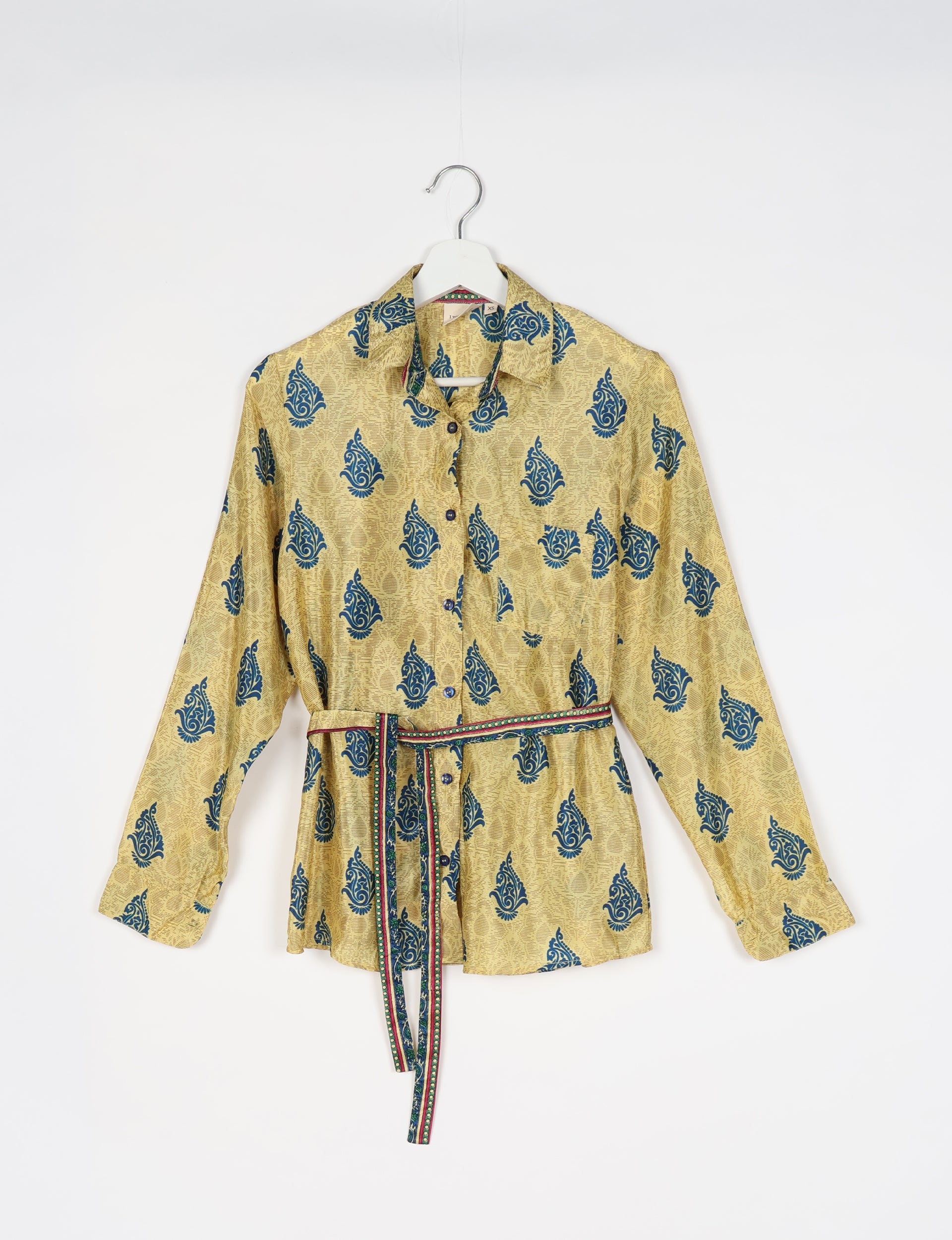 A slim-fit, long-sleeve shirt featuring a semi-spread collar and front button-down closure and a front pocket. It is constructed with standard shirt cuffs finished with button fastenings. The shirt includes a detachable self-fabric belt that can be styled at the waist or worn as a neck tie.